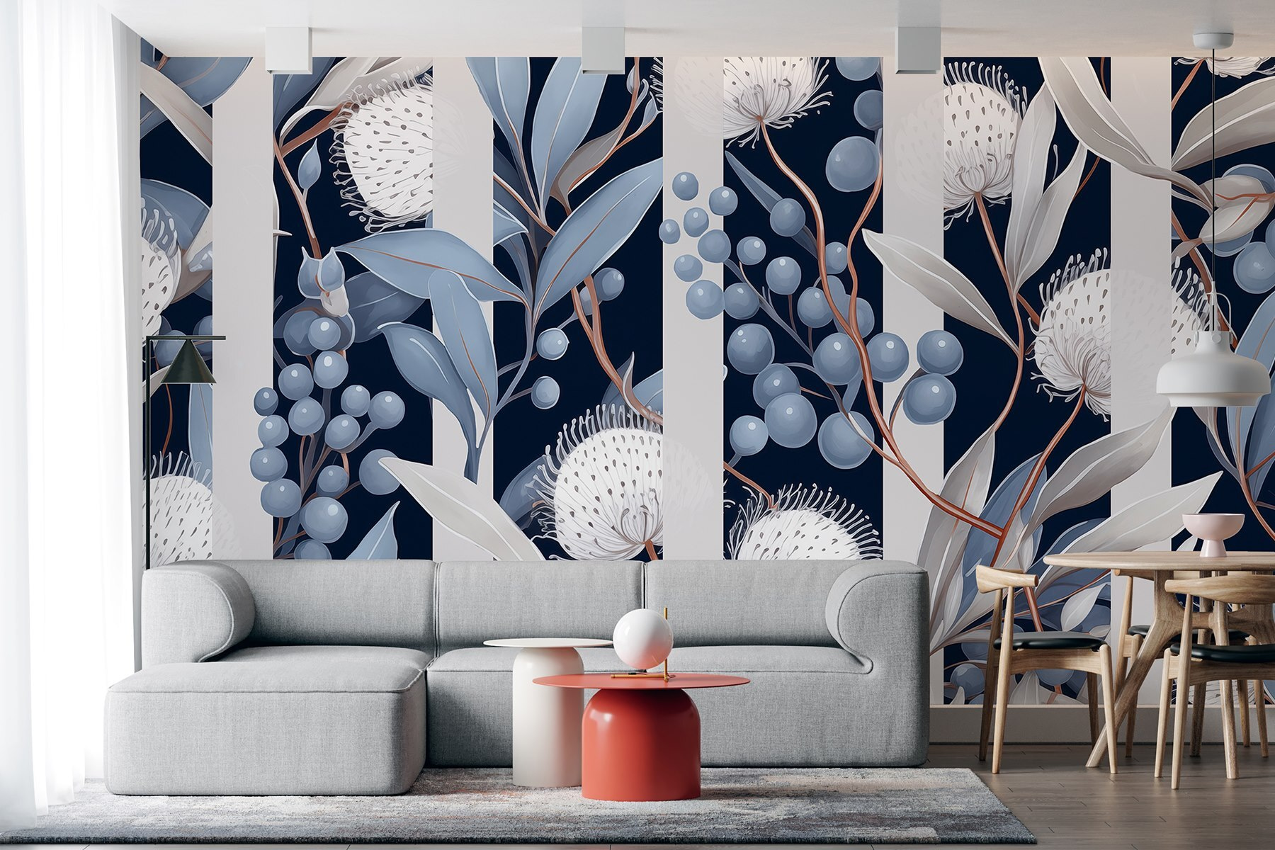 Aqui está um mural que fará com que as suas paredes sussurrem doces palavras todas as manhãs. Imagine acordar com esta deliciosa dança de flores azuis e brancas, como um jardim secreto escondido no seu quarto. As folhas enrolam-se em suaves laços, enquanto as flores – oh, as flores – rodopiam como se estivessem presas num ballet de brisa. Coloque-o na sua sala de estar e veja as conversas fluírem, inspiradas pela arte da própria natureza. É como ter uma peça de beleza serena e de outro mundo mesmo em casa. Não é encantador?