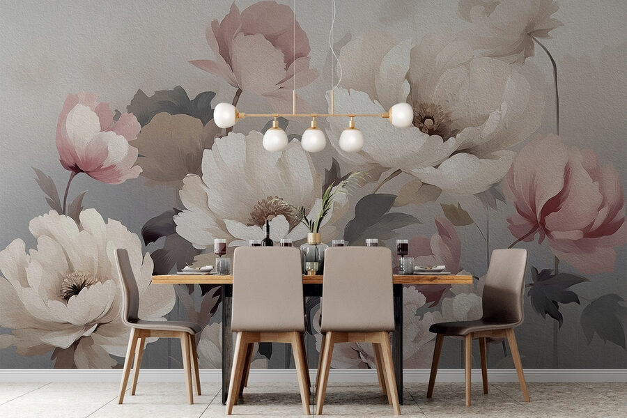Transforme qualquer espaço com este deslumbrante mural de parede pintado com flores delicadas, uma mistura perfeita de peónias e rosas. Imagine entrar numa sala onde os tons suaves de blush e os brancos cremosos florescem na parede, acrescentando instantaneamente calor e carácter. É como ter um jardim dentro de casa – sem necessidade de rega!