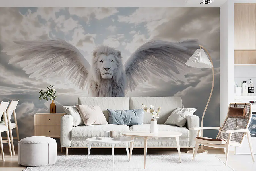 O contraste suave do pelo branco e macio do leão contra o céu dá-lhe uma vibração suave e animadora. Suscita conversas e atrai olhares curiosos. Perfeito para uma sala de estar divertida ou um espaço de trabalho criativo, este mural convida a uma sensação de maravilha e coragem. Os amigos podem até pensar que descobriu um portal secreto – como isso é divertido? Decore as suas paredes com um pouco de magia.