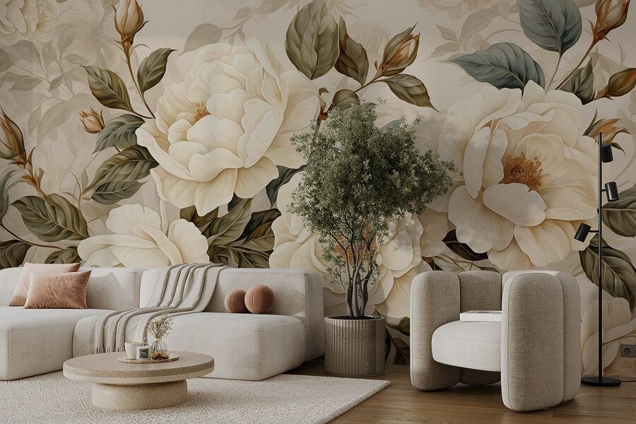 Transformar uma divisão num oásis acolhedor é muito fácil com “Flores delicadas em tons suaves”. Imagine entrar num espaço onde peónias cremosas florescem sem esforço nas paredes, envolvendo-o em tons suaves que parecem quase de sonho. É como ter o seu próprio jardim, sem as abelhas incómodas. Perfeito para aqueles dias em que só apetece bebericar chá, enrolar-se com um bom livro ou sonhar acordado com piqueniques na primavera.