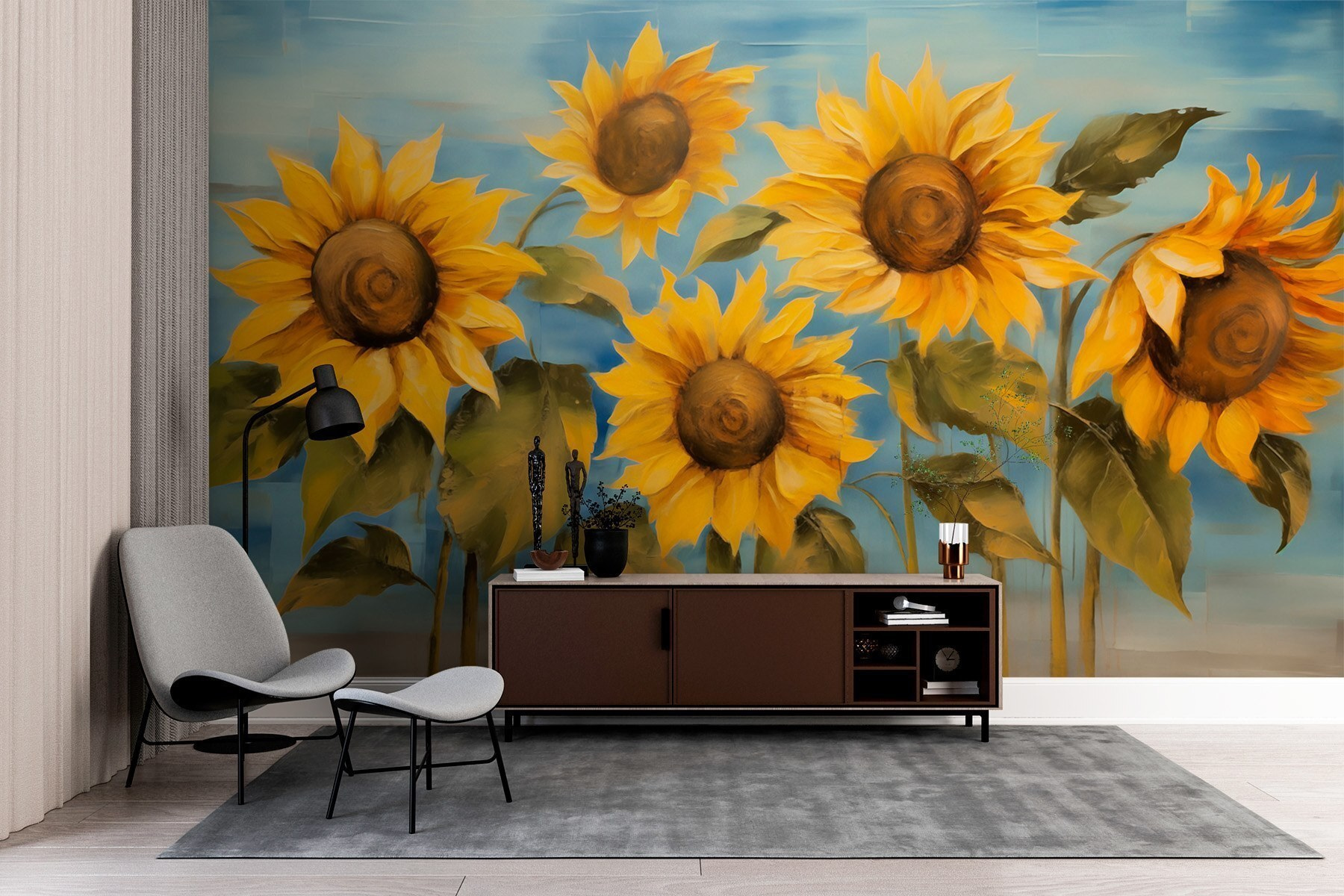 Ilumine qualquer divisão com este deslumbrante mural de parede com alegres girassóis a dançar sob um suave céu azul. Imagine chegar a casa depois de um longo dia, apenas para ser recebido pelos amarelos vibrantes e verdes quentes que parecem gritar alegria. É como ter um pequeno pedaço de natureza no seu espaço de vida. Quer seja num recanto acolhedor ou numa área de reunião animada, o mural convida ao sorriso e ao calor. Imagine amigos a conversar ou crianças a brincar, enquanto estas lindas flores vigiam. Uma forma perfeita de dar um toque de cor e trazer o ar livre para dentro de casa!