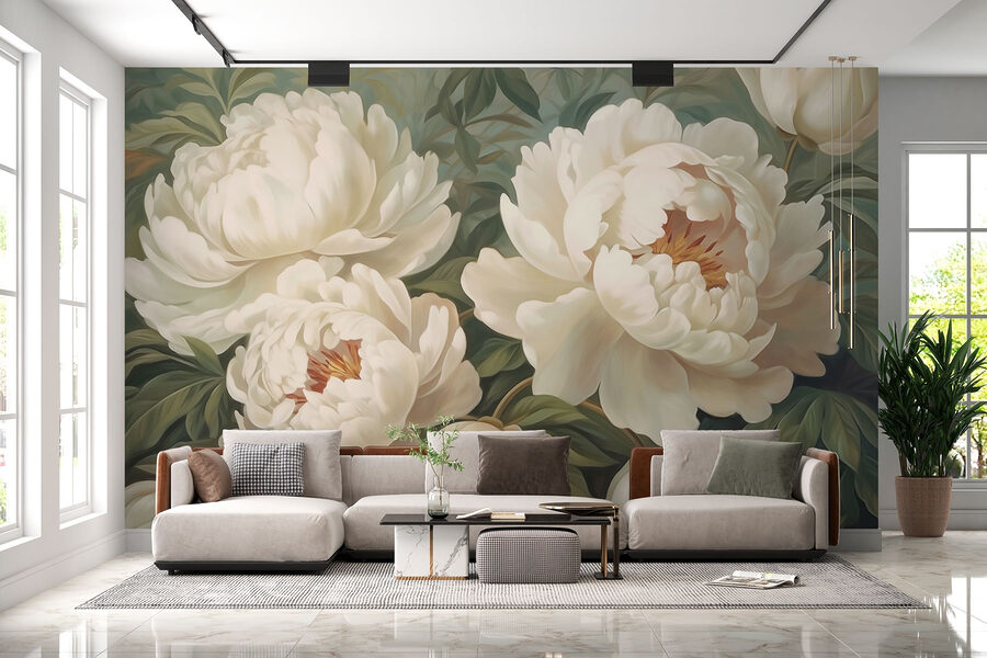 Transforme qualquer divisão com este mural encantador que exibe flores exuberantes de delicadas pétalas brancas. Imagine entrar num espaço onde as peónias suaves captam a luz, fazendo com que todo o local pareça um sereno retiro de jardim. É perfeito para aqueles dias em que o mundo exterior parece demasiado caótico – basta olhar para ele e *respirar*.