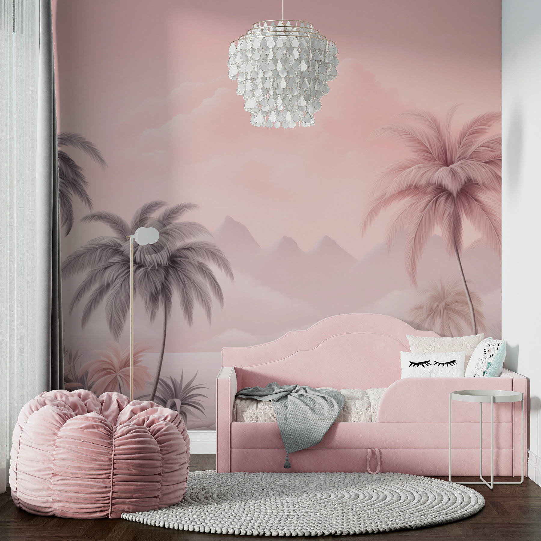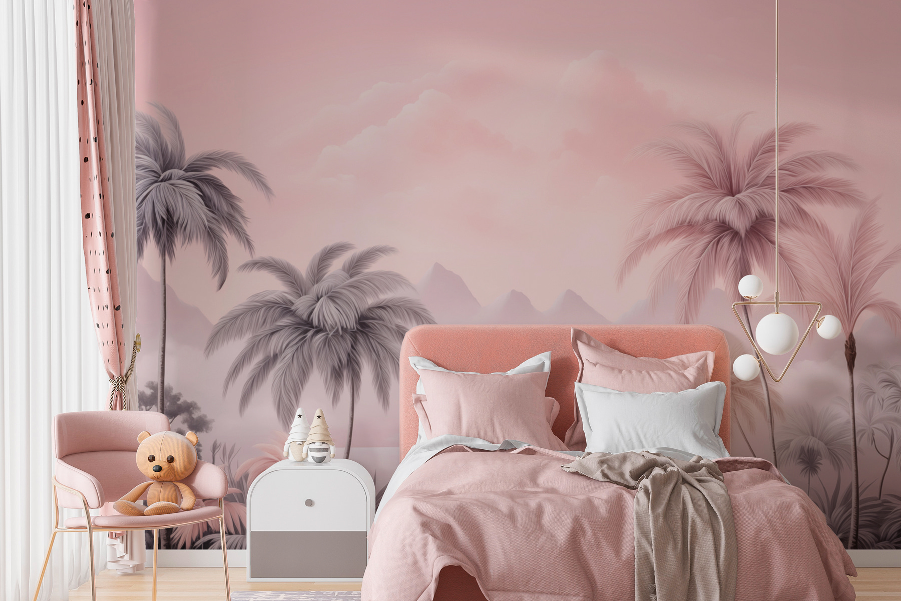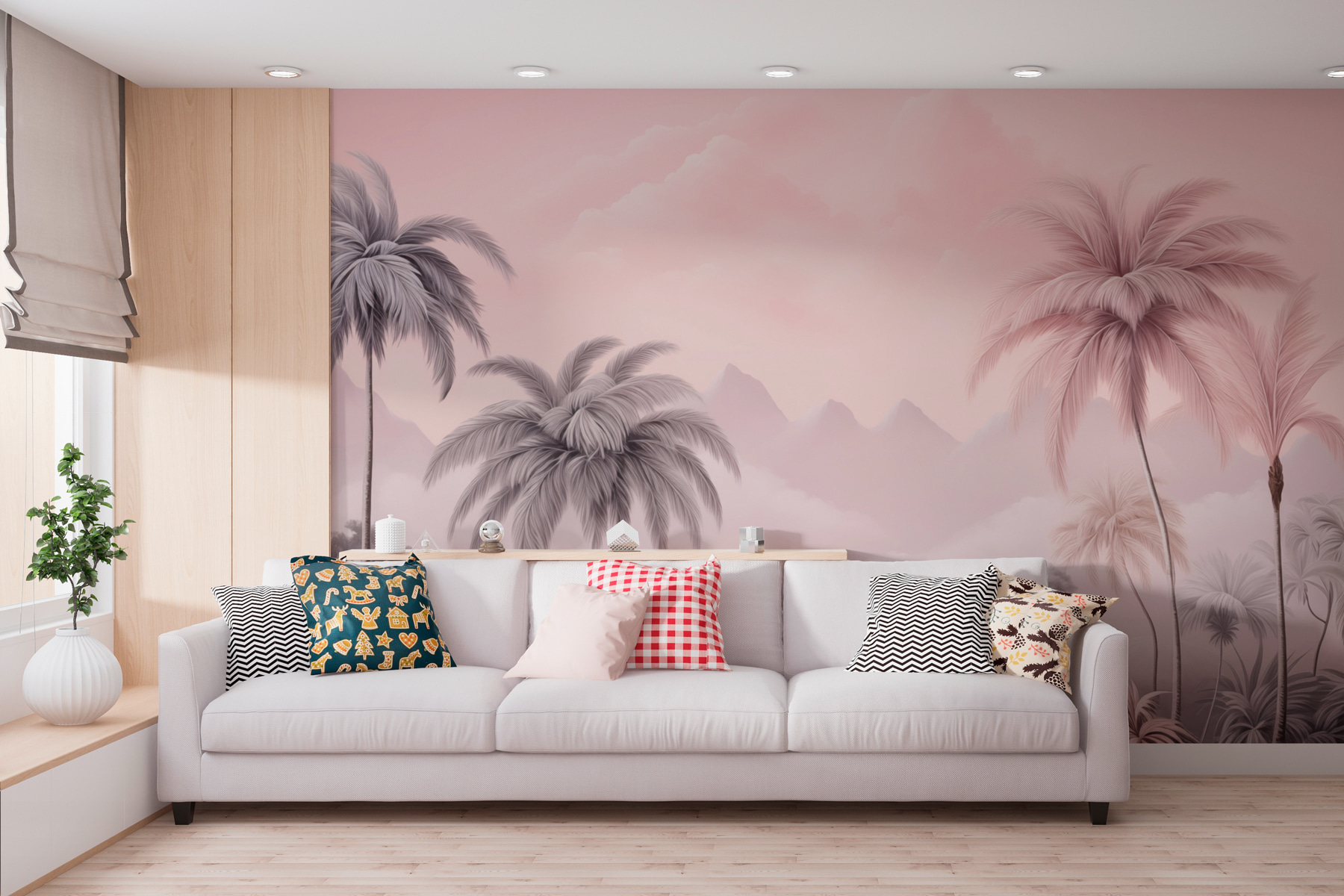 Transforme o seu espaço num refúgio tranquilo com este deslumbrante mural de parede com palmeiras exuberantes e montanhas serenas. Imagine-se a beber a sua bebida favorita enquanto os tons suaves de rosa e cinzento o envolvem, fazendo com que cada dia pareça umas férias. É perfeito para criar uma vibração relaxada – quer seja na sala de estar ou naquele recanto de leitura acolhedor que você gostaria de ter! A forma como as montanhas espreitam por entre as palmeiras? Pura magia. É como se a natureza fosse trazida para dentro de casa, acalmando a alma um olhar de cada vez. Além disso, é suficientemente ousado para ser um ponto de partida para uma conversa – quem não admiraria isso?