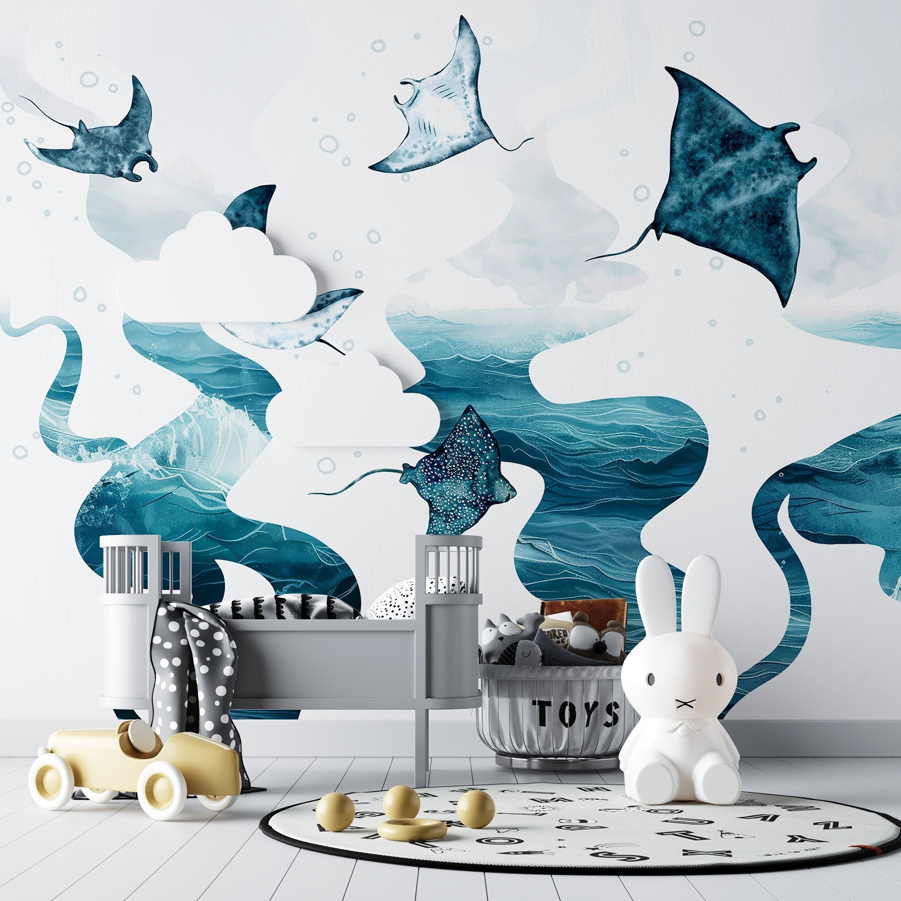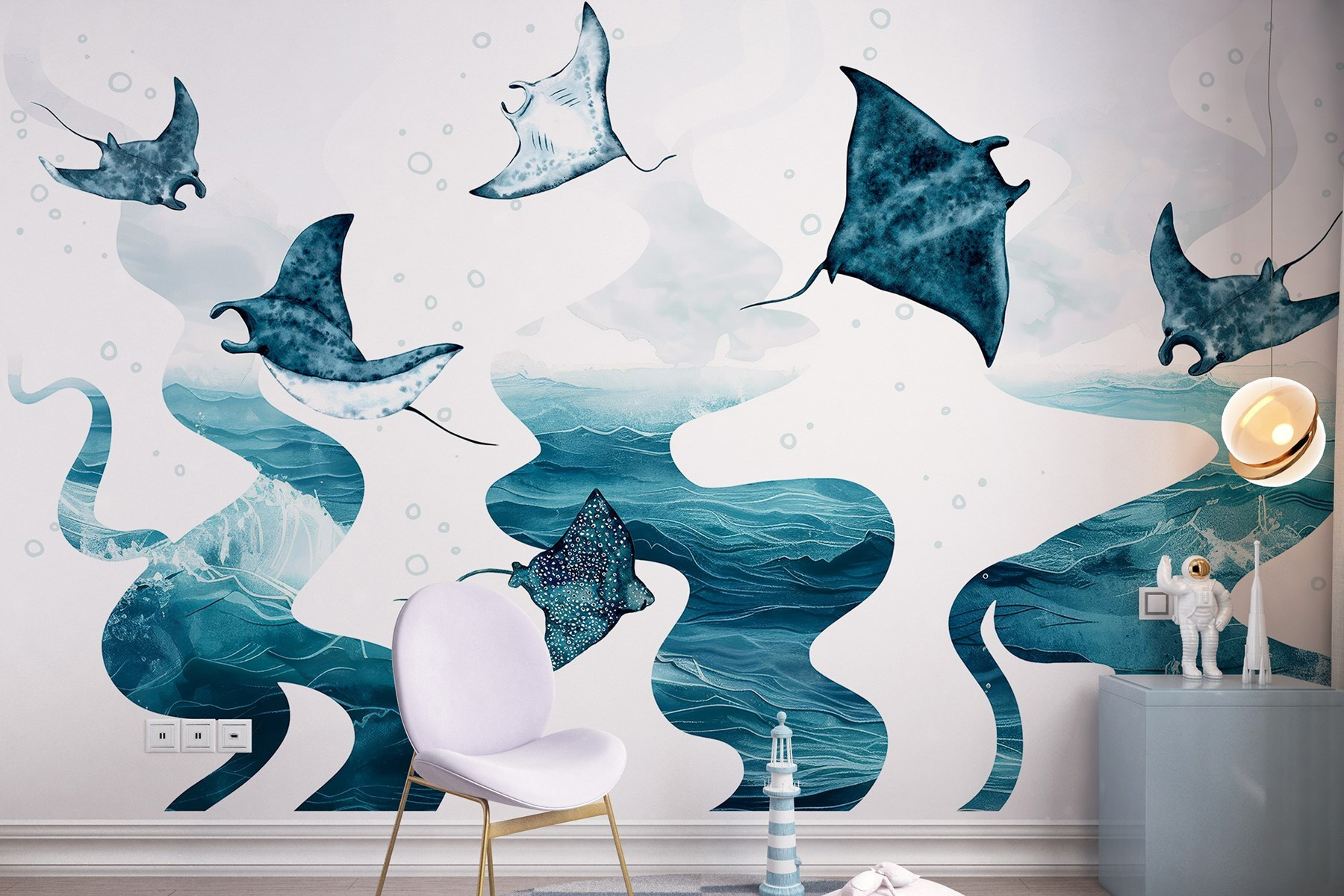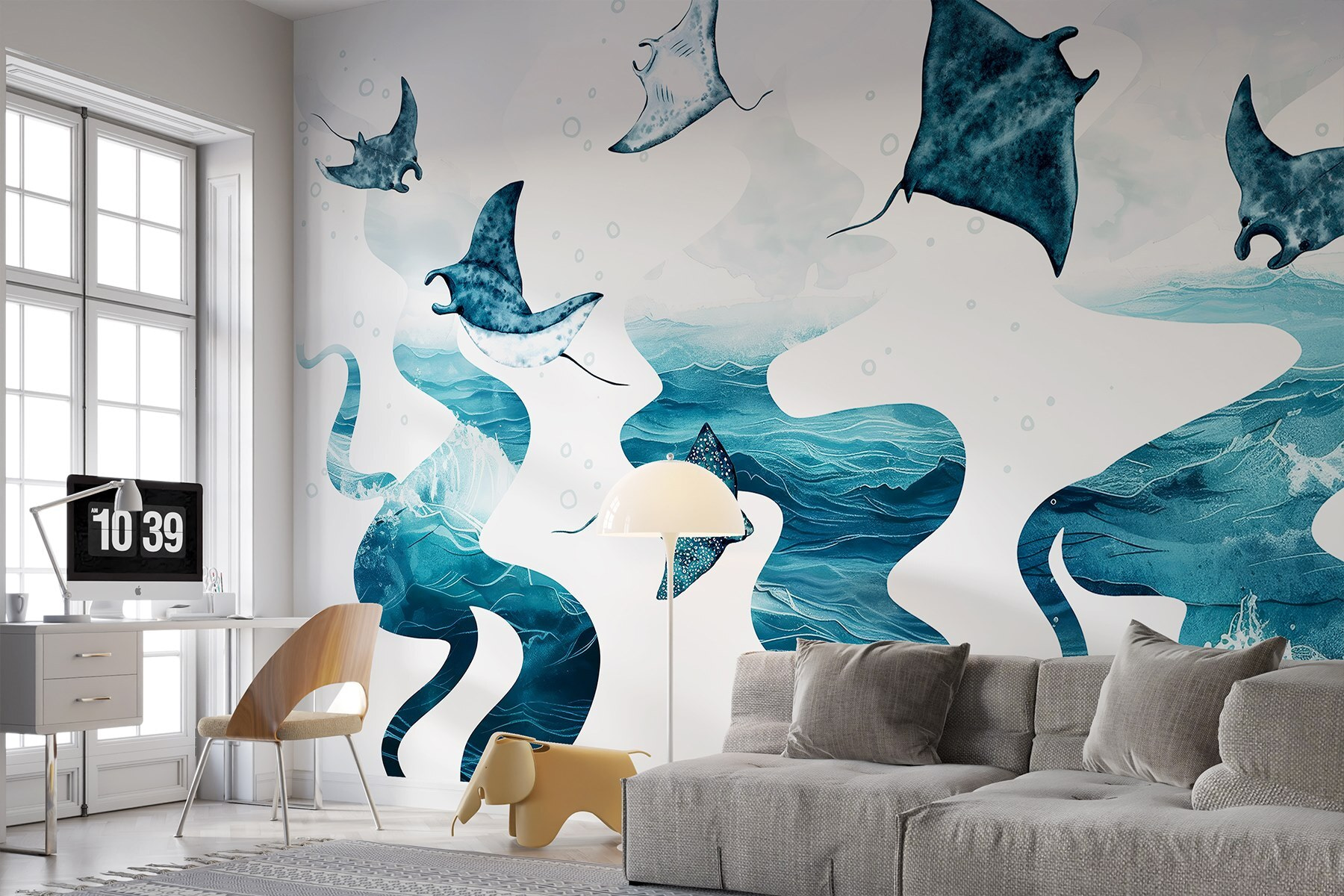 Transforme qualquer espaço numa serena fuga subaquática com este deslumbrante mural de arraias a deslizar graciosamente pela água. Imagine entrar numa sala onde os azuis suaves criam uma vibração calma, quase como umas mini-férias em casa. A fluidez do design fá-lo-á sonhar com as ondas do mar e a brisa suave, tornando-o perfeito para um recanto de praia ou uma sala de estar descontraída. Além disso, quem é que não gosta de arraias? São como os gentis gigantes do mar, trazendo uma pitada de maravilha e um toque de personalidade às suas paredes. Não se trata apenas de decoração; é uma recordação diária da beleza da natureza, inspirando subtilmente o relaxamento e os devaneios de escapadelas à beira-mar. Mergulhe neste mural e deixe a sua imaginação nadar livremente!