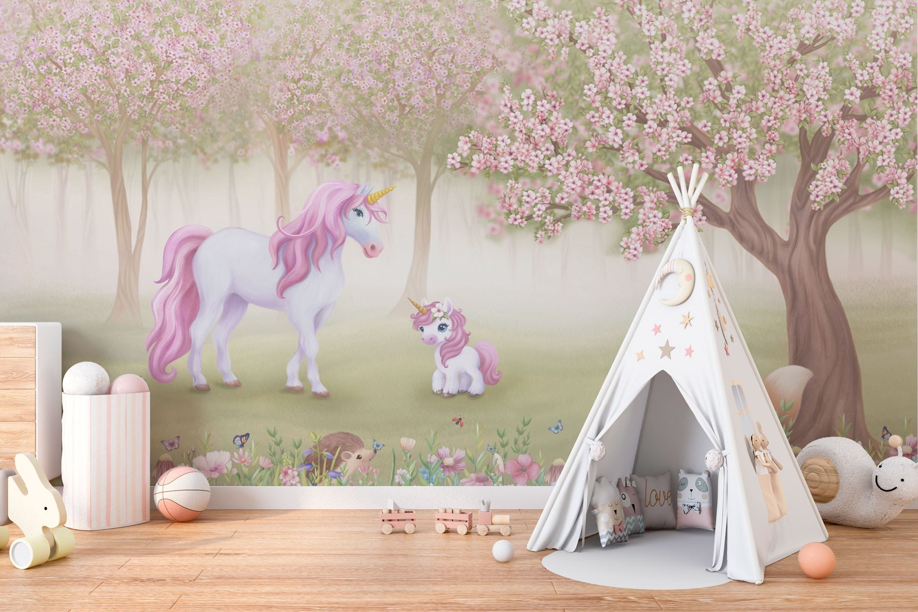 Transforme qualquer divisão num país das maravilhas caprichoso com este mural encantador que apresenta um unicórnio e os seus amigos peludos. Imagine as delicadas flores cor-de-rosa a balançar suavemente, enchendo o ar de doçura – perfeitas para despertar a alegria todos os dias. O duo de unicórnios e adoráveis criaturas da floresta convida a uma energia suave e lúdica difícil de resistir. Imagine tardes aconchegantes passadas a ler ou a sonhar acordado, com a beleza da natureza apenas a um olhar de distância. Este mural não se limita a decorar – conta uma história, trazendo calor e uma pitada de magia às paredes que precisam de um pouco de alegria. Perfeito para espaços infantis ou para quem tem um coração jovem!