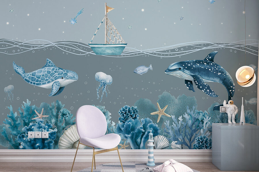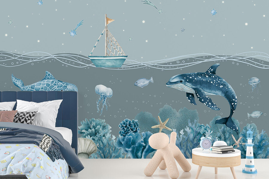 Transforme o seu espaço numa serena fuga subaquática com o mural de parede “Sea Life”. Imagine acordar todos os dias com golfinhos brincalhões e medusas suaves a dançar nas suas paredes. Esta cena de sonho capta um pequeno barco encantador a deslizar por um mar tranquilo, rodeado por corais vibrantes e estrelas-do-mar. É como ter um pedaço do oceano em casa – sem o cabelo salgado! Perfeito para um quarto de criança ou mesmo para um recanto de leitura acolhedor, este mural dá um toque de capricho e calma. Deixe que as cores o envolvam, criando uma vibração calma que pode inspirar devaneios de aventuras no oceano.