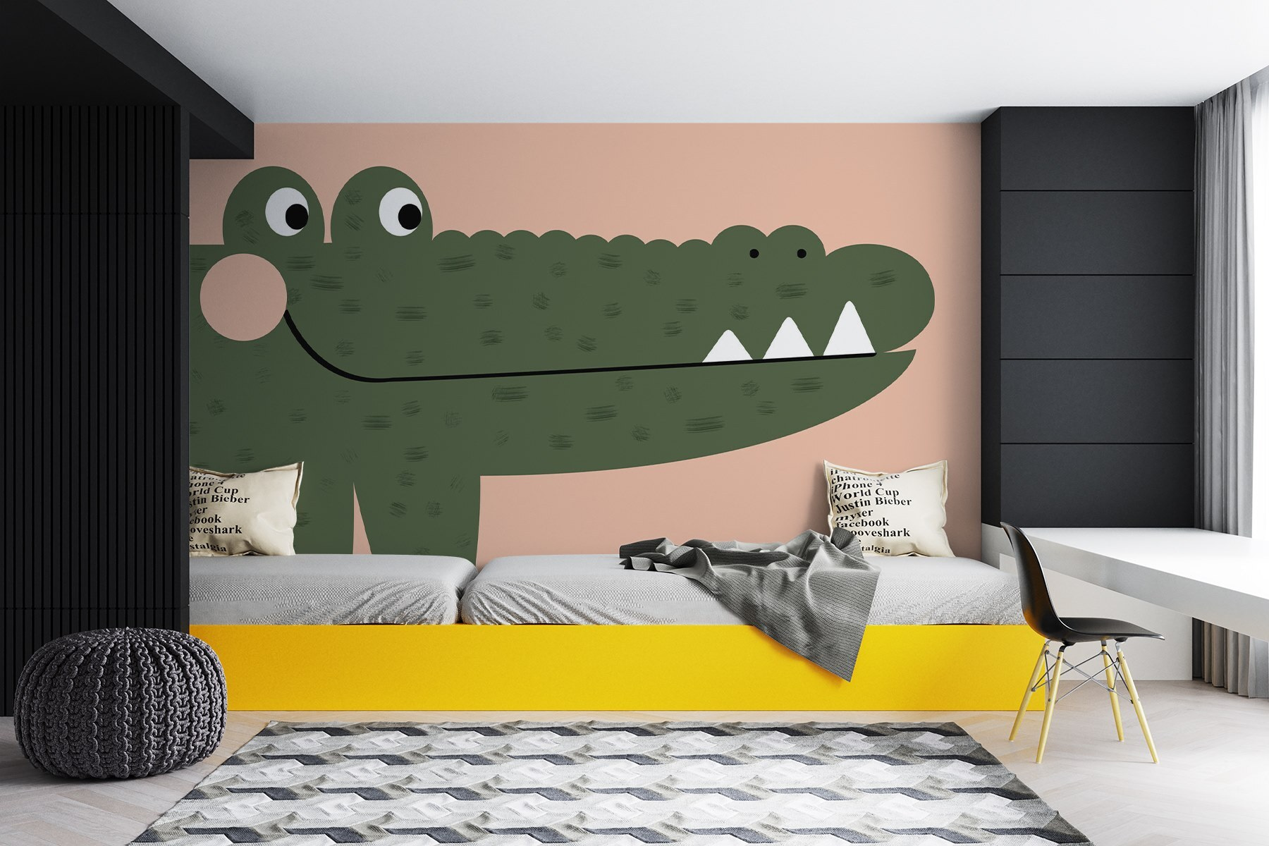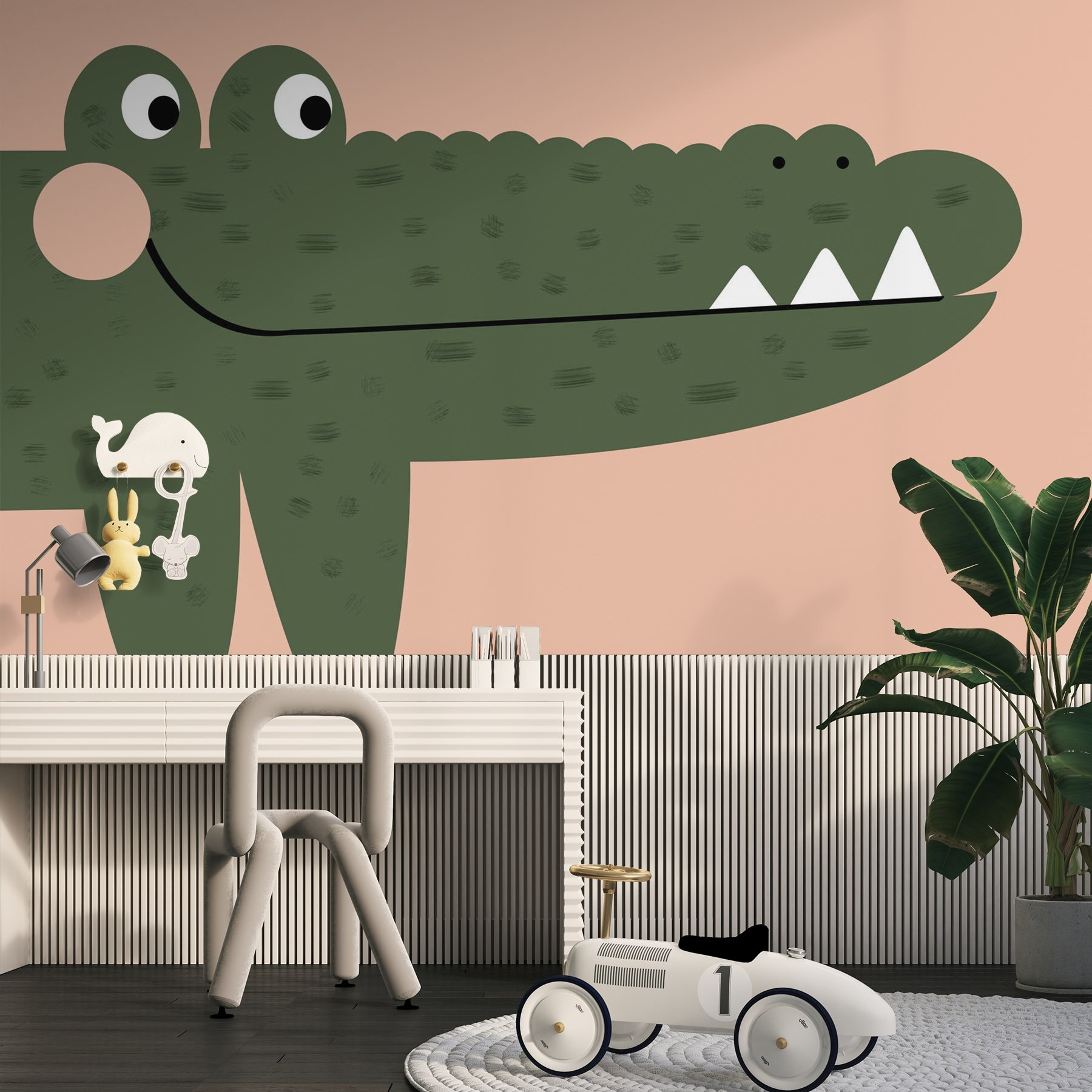 Transforme qualquer espaço com este encantador mural de parede com um simpático crocodilo! O seu design lúdico acrescenta um toque de capricho que ilumina infantários, salas de jogos ou mesmo um canto acolhedor da sua sala de estar. Imagine crianças a rir-se sempre que passam, ou receber amigos que não conseguem deixar de sorrir com o sorriso peculiar deste crocodilo deliciosamente ilustrado. As cores suaves e as formas divertidas convidam à criatividade, proporcionando o cenário perfeito para brincadeiras imaginativas ou momentos de contar histórias. É mais do que uma simples decoração; é um convite à aventura! Deixe que este alegre crocodilo desperte memórias divertidas enquanto está pendurado na sua parede. Quem não gostaria de ter um companheiro brincalhão a vigiar o seu espaço?