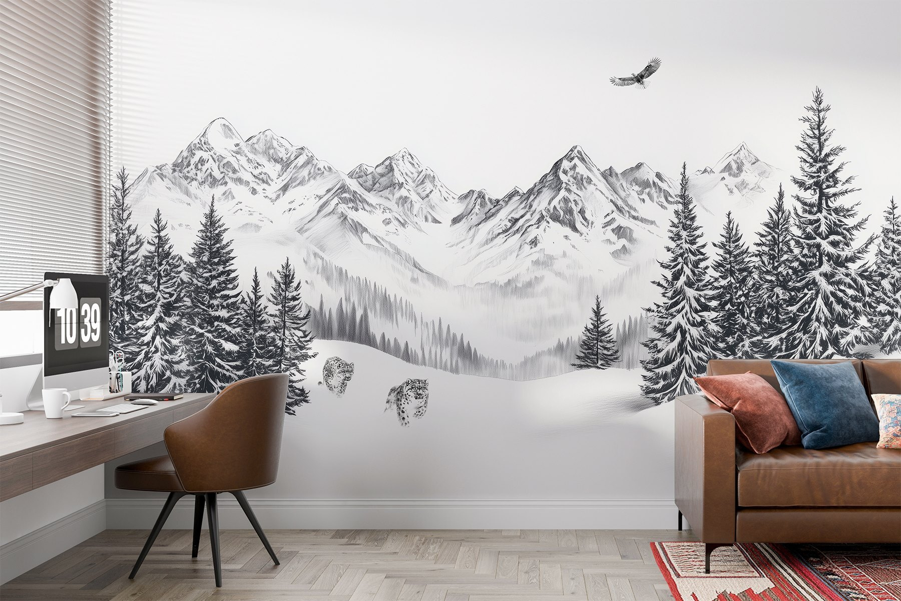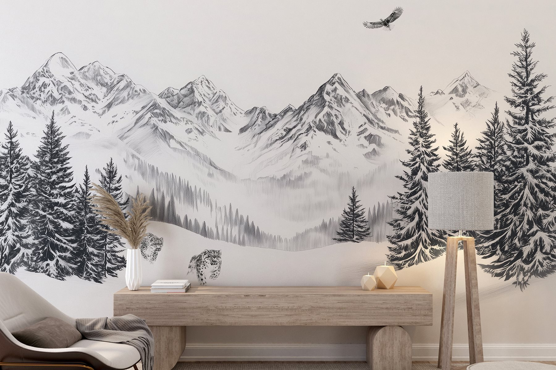 Transforme qualquer parede num refúgio sereno com este deslumbrante mural de paisagem de montanha nevada. Imagine o silêncio suave da neve a cair enquanto as montanhas majestosas se erguem nas nuvens e um pássaro solitário desliza por cima. É como trazer um pedaço de natureza pacífica para dentro de casa. Imagine-se a beber o seu café da manhã, a contemplar esta beleza e a sentir uma onda de calma a invadi-lo. Perfeito para recantos acolhedores ou paredes arrojadas, este mural não só acrescenta carácter, como também convida a sonhar acordados com caminhadas na neve e ar fresco da montanha. Além disso, quem não gostaria de ter um par de leopardos atrevidos por perto? É um início de conversa e uma fuga, tudo num só!