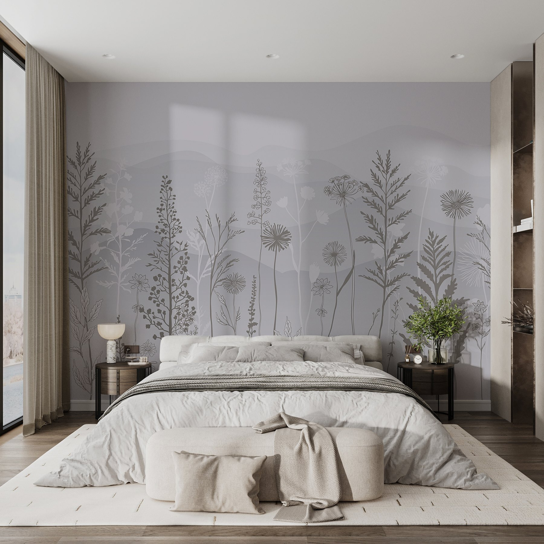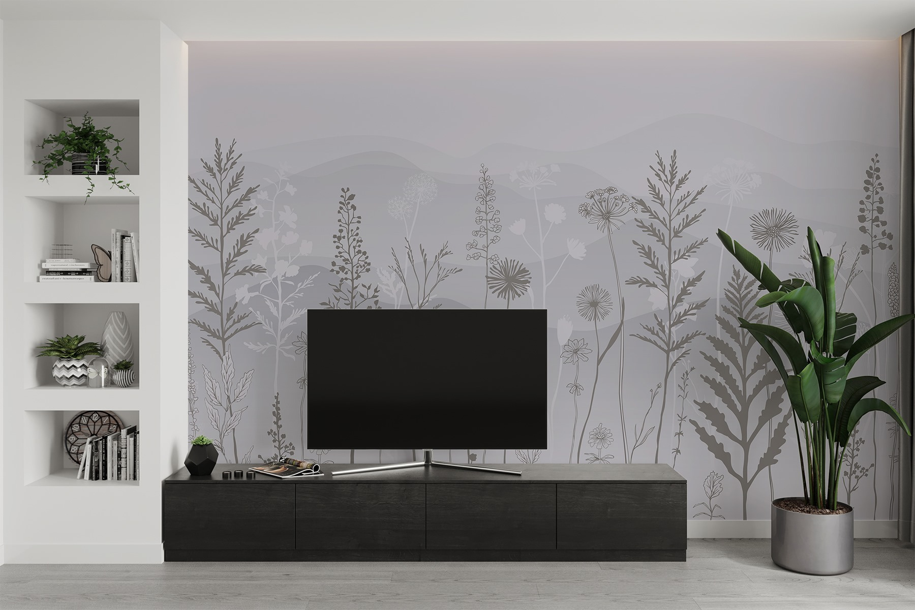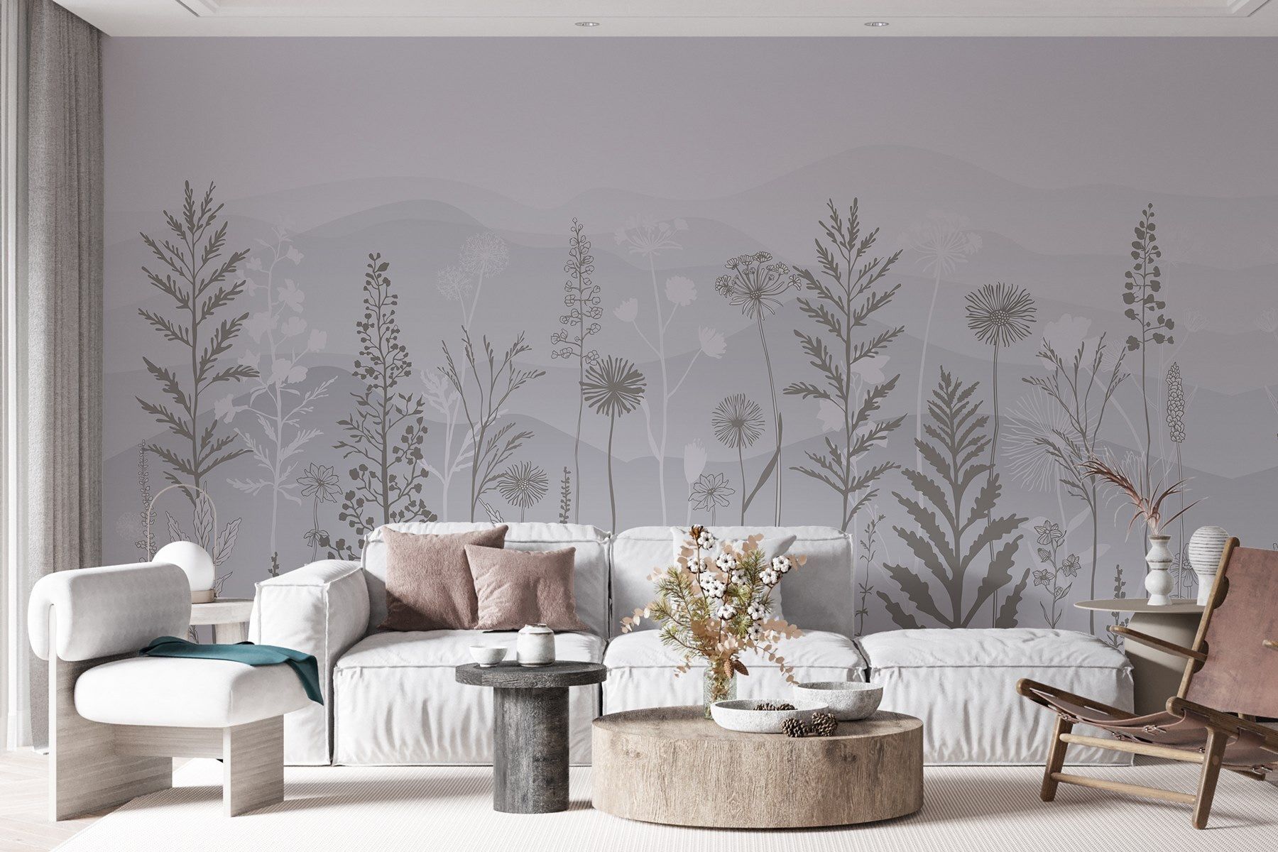 Transforme qualquer espaço com este deslumbrante mural de parede com um fundo cinzento e branco de sonho, polvilhado com plantas delicadas e montanhas suaves. Imagine entrar num pequeno oásis sereno mesmo na sua sala de estar ou no seu quarto – uma lufada de ar fresco sem o incómodo da jardinagem. As cores suaves convidam a vibrações calmas, perfeitas para descontrair após um longo dia. Pense em reuniões acolhedoras onde os amigos ficam maravilhados com a sua decoração elegante enquanto bebe chá e desfruta do ambiente tranquilo. É como trazer uma fatia da natureza para dentro de casa, sem os insectos! Eleve as suas paredes e deixe a sua criatividade florescer.