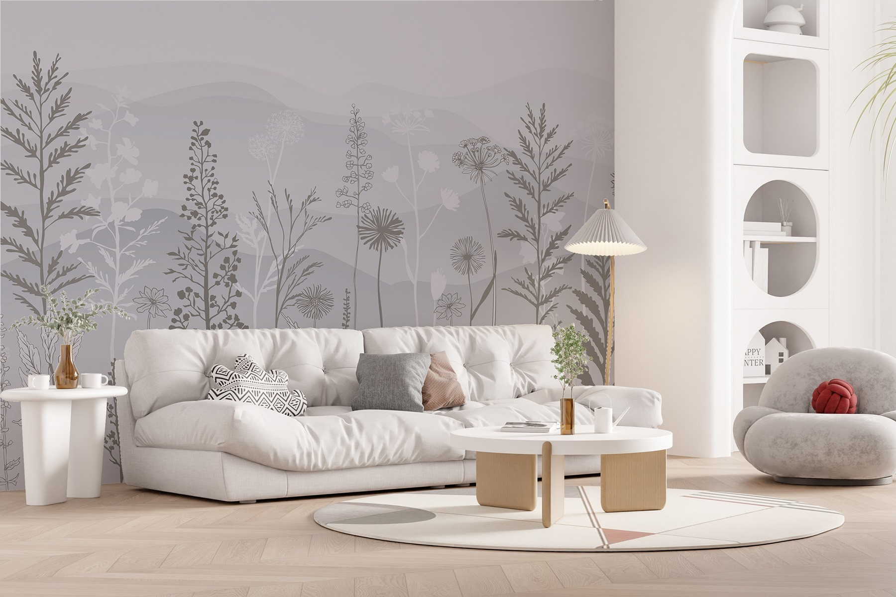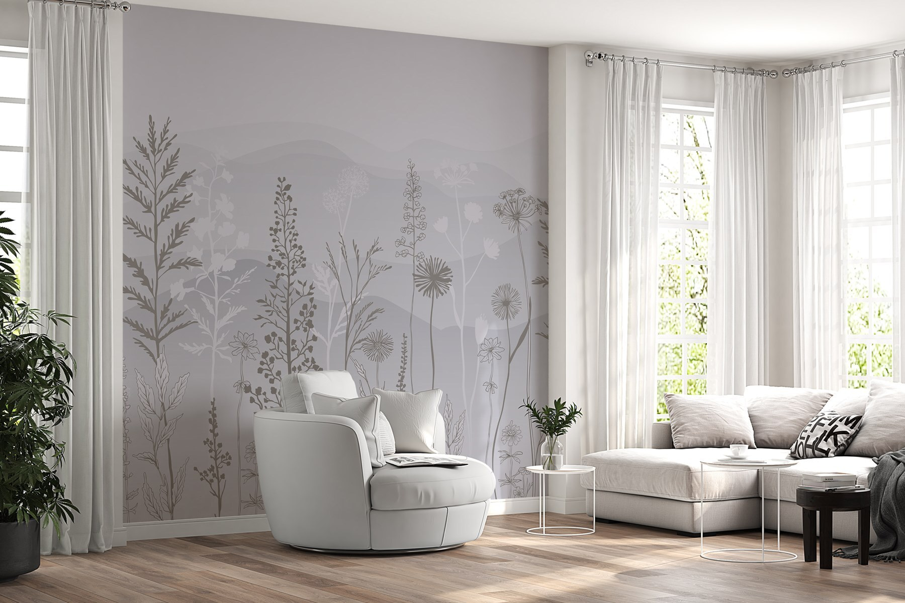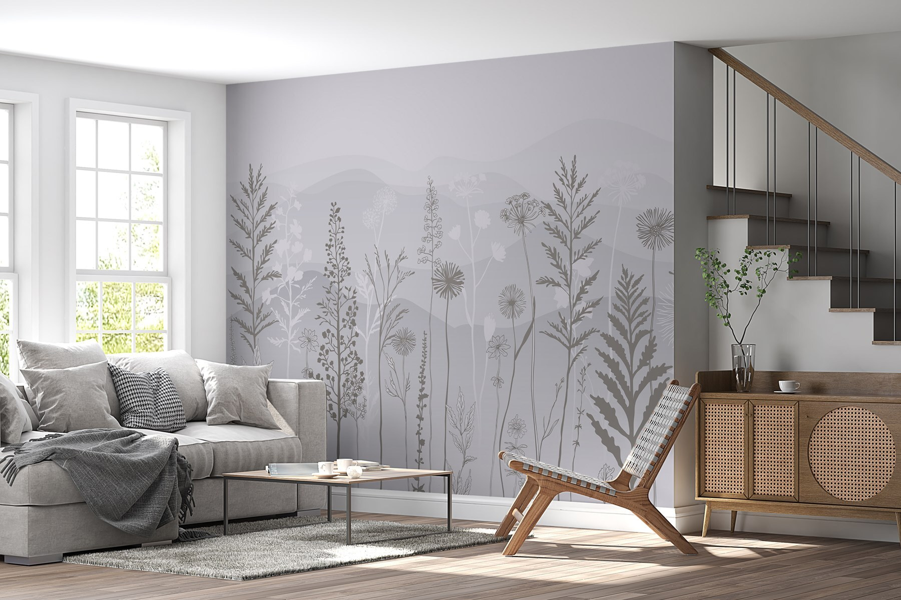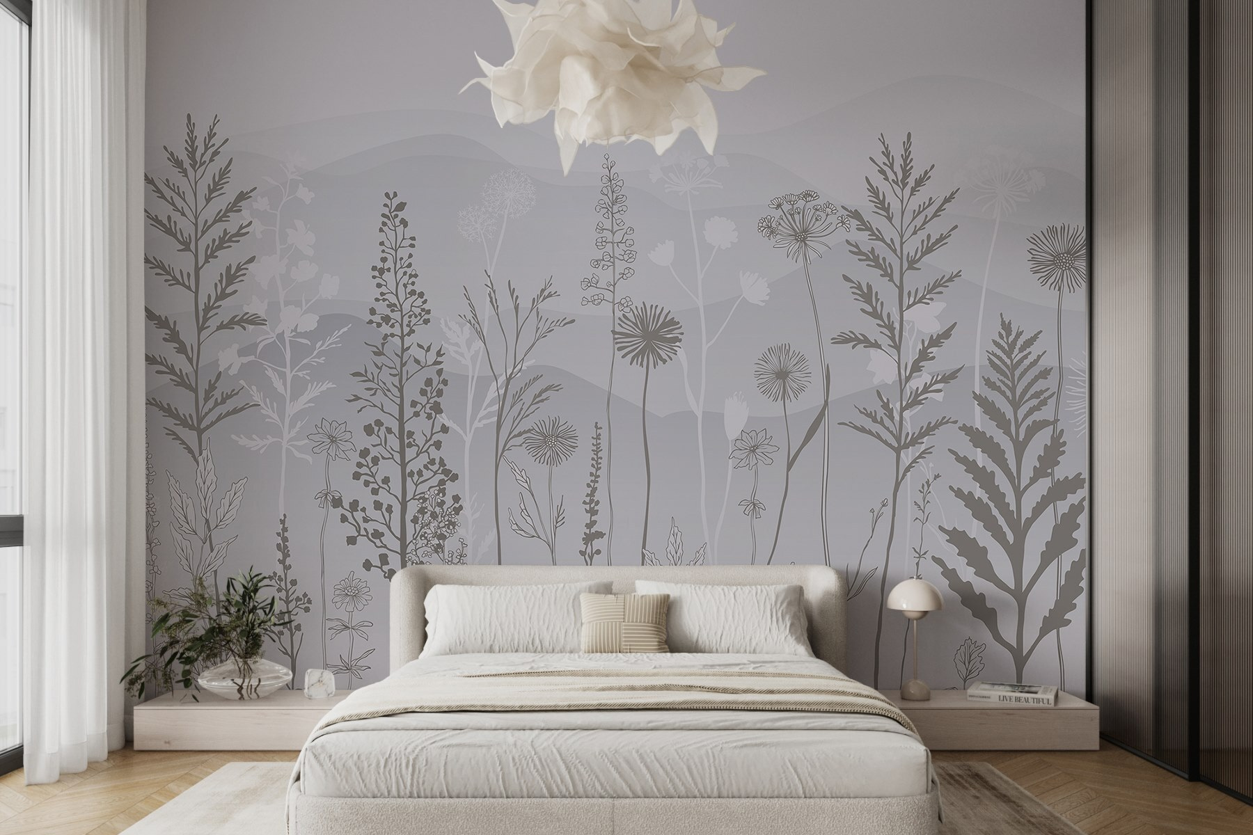 Transforme qualquer espaço com este deslumbrante mural de parede com um fundo cinzento e branco de sonho, polvilhado com plantas delicadas e montanhas suaves. Imagine entrar num pequeno oásis sereno mesmo na sua sala de estar ou no seu quarto – uma lufada de ar fresco sem o incómodo da jardinagem. As cores suaves convidam a vibrações calmas, perfeitas para descontrair após um longo dia. Pense em reuniões acolhedoras onde os amigos ficam maravilhados com a sua decoração elegante enquanto bebe chá e desfruta do ambiente tranquilo. É como trazer uma fatia da natureza para dentro de casa, sem os insectos! Eleve as suas paredes e deixe a sua criatividade florescer.