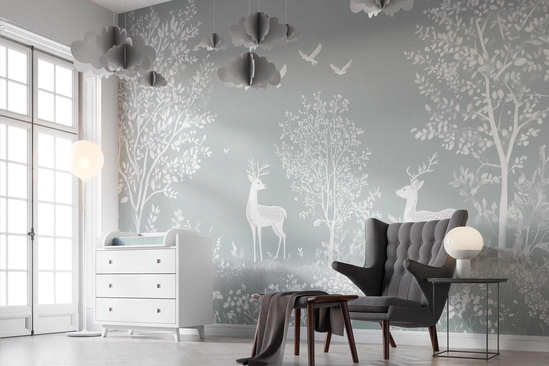 Transforme o seu espaço numa fuga serena com este mural de parede encantador que apresenta graciosos veados brancos a vaguear por uma floresta suave e frondosa. Imagine entrar no seu quarto e sentir-se como se tivesse entrado numa floresta de sonho repleta de suaves sussurros da natureza. Os delicados pássaros que esvoaçam por cima dão-lhe um toque de capricho, tornando-o o cenário perfeito para noites acolhedoras ou manhãs inspiradoras. É como ter um retiro tranquilo mesmo em casa! Quer esteja a beber chá ou a ler um livro, este mural convida a esses pequenos e doces momentos de calma. Além disso, é um ótimo início de conversa – quem não gostaria de falar sobre a sua floresta secreta?