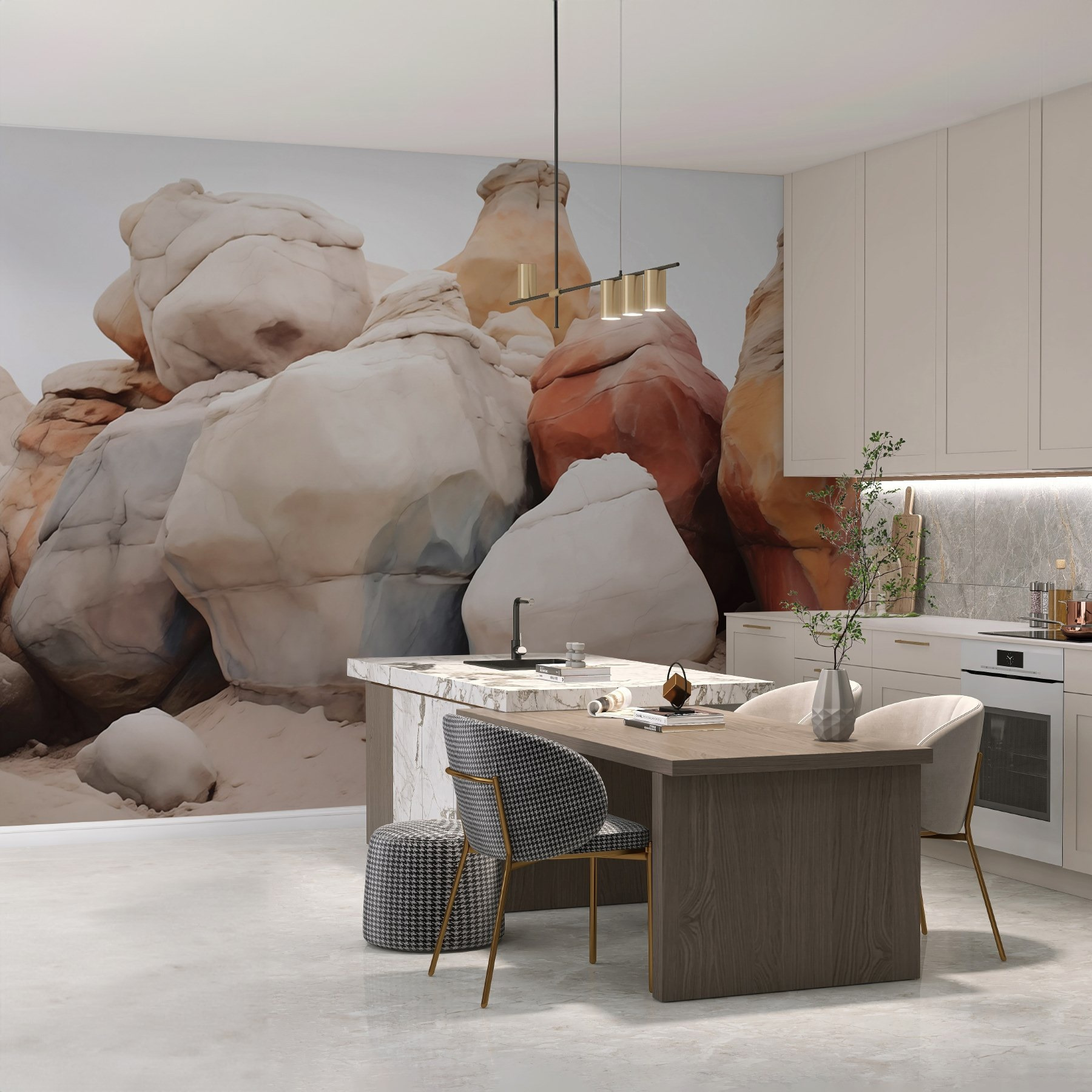 Transforme o seu espaço com este deslumbrante mural de parede que apresenta um grupo de grandes rochas aninhadas num ambiente suave e arenoso. É como trazer um pedaço da natureza diretamente para a sua casa, evocando dias de praia preguiçosos e o som calmante das ondas. Os tons suaves das rochas acrescentam calor, enquanto os tons de areia fazem com que se sinta tão acolhedor. Imagine-se a relaxar na sua sala de estar, a beber uma bebida e a perder-se na beleza desta paisagem serena. Não é apenas uma decoração; é um convite para sonhar acordado, lembrando-o de momentos tranquilos passados na natureza. Perfeito para criar uma vibração descontraída, este mural fará com que os seus amigos pensem que tem um refúgio secreto na praia escondido algures. Deixe essas vibrações entrarem!