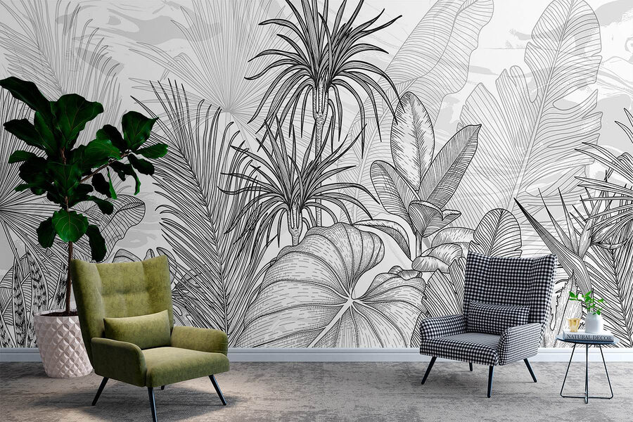 Transforme o seu espaço com este espantoso mural de parede a preto e branco, que capta a beleza intrincada das plantas tropicais. Imagine-se a entrar numa selva serena sempre que entra na sala. Estes contornos frondosos são como um elegante jardim secreto que complementa qualquer decoração – perfeito para criar um recanto de leitura acolhedor ou uma área de jantar vibrante. O contraste das formas arrojadas com um pano de fundo suave convida a uma imaginação divertida. Deixe a beleza suave da natureza inspirar o relaxamento, e quem sabe? Os seus amigos podem pensar que tem uma mini floresta tropical em casa.