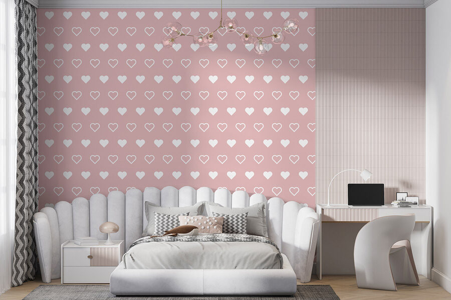 Ilumine qualquer espaço com este mural de parede encantador que apresenta um padrão encantador de corações brancos num fundo cor-de-rosa alegre. Imagine entrar numa sala que instantaneamente se sente como um abraço acolhedor – este mural faz exatamente isso! É perfeito para um berçário, uma sala de estar divertida, ou mesmo um escritório chique onde se quer um toque de felicidade.