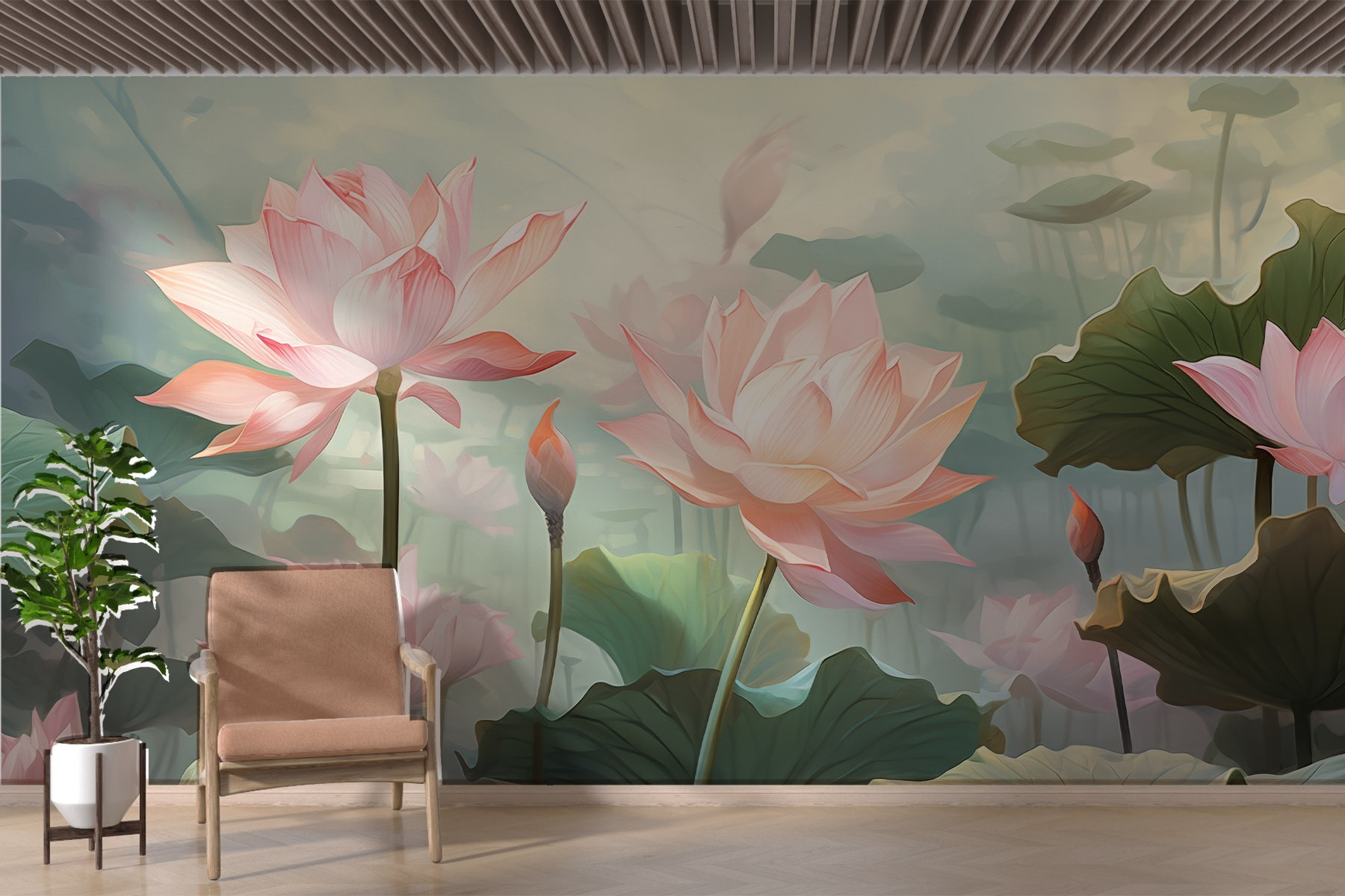 Transforme qualquer divisão num oásis sereno com este mural deslumbrante que apresenta um grupo encantador de flores cor-de-rosa aninhadas entre folhas verdes exuberantes. Imagine entrar no seu espaço e sentir uma calma instantânea como uma brisa suave num dia quente. Os tons suaves e os detalhes delicados convidam a uma sensação de paz, tornando-o perfeito para um recanto de leitura acolhedor ou mesmo para uma cozinha vibrante.