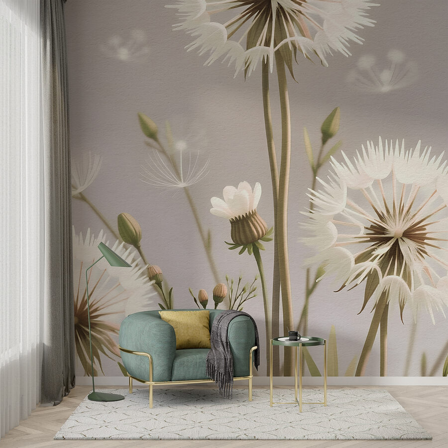 Transforme o seu espaço com o mural “Delicate Blooms in Soft Palette”. Este belo design traz um toque de natureza para dentro de casa, com adoráveis dentes-de-leão e flores suaves. Imagine acordar e ser recebido por esta obra de arte calmante – é como um sussurro suave do jardim!