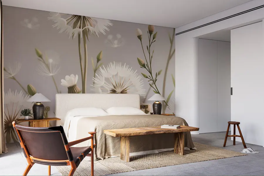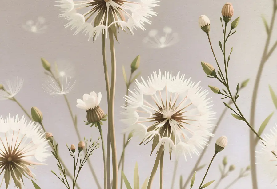 Transforme o seu espaço com o mural “Delicate Blooms in Soft Palette”. Este belo design traz um toque de natureza para dentro de casa, com adoráveis dentes-de-leão e flores suaves. Imagine acordar e ser recebido por esta obra de arte calmante – é como um sussurro suave do jardim!