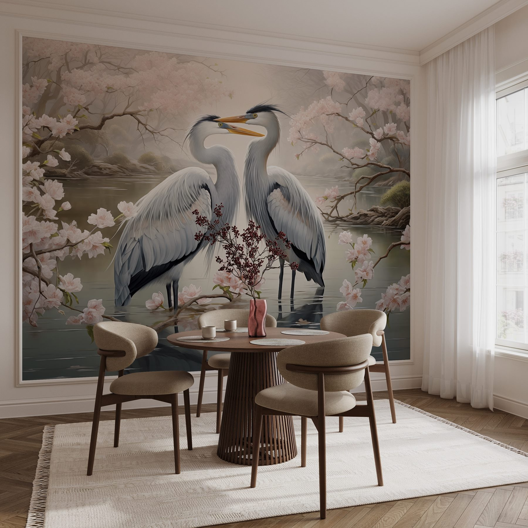 Transforme o seu espaço com este mural de parede encantador que apresenta um par de graciosos pássaros brancos em água serena, rodeados por delicadas flores cor-de-rosa. É como ter uma fatia de um tranquilo jardim japonês mesmo em casa! Imagine-se a beber chá enquanto a luz do sol dança na superfície da água, lançando reflexos divertidos. Os tons suaves da aguarela criam um ambiente convidativo e acolhedor – perfeito para um recanto de leitura ou um retiro tranquilo. É uma recordação encantadora da beleza da natureza e, sinceramente, quem não gostaria de ter um pouco de romance com penas nas suas paredes? Brilhante, suave e totalmente encantador, este mural vai certamente roubar o espetáculo – tal como aqueles pássaros!
