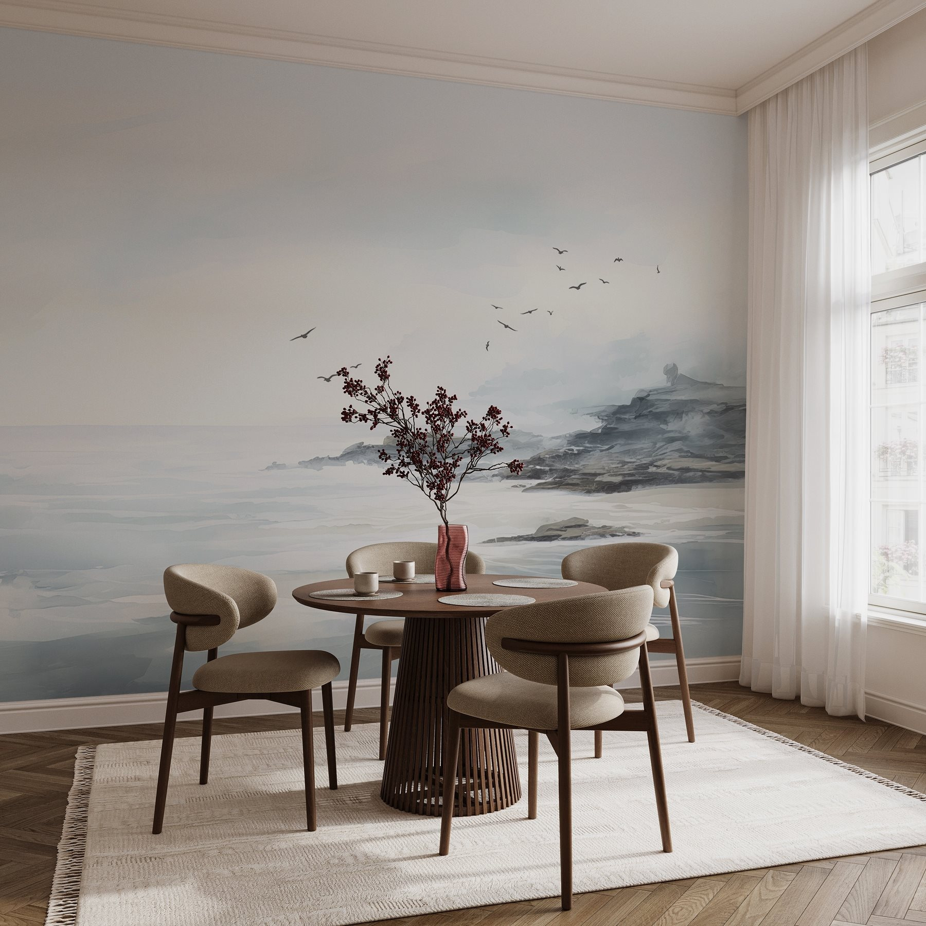 Transforme qualquer divisão com este mural encantador, “Pássaros a voar sobre uma praia rochosa”. Imagine-se a acordar com os tons suaves do oceano e com aqueles pássaros de sonho a navegar pelo céu. É como umas mini-férias mesmo na sua parede! As cores suaves criam uma vibração relaxante, perfeita para um espaço de vida descontraído ou um retiro sereno no quarto.