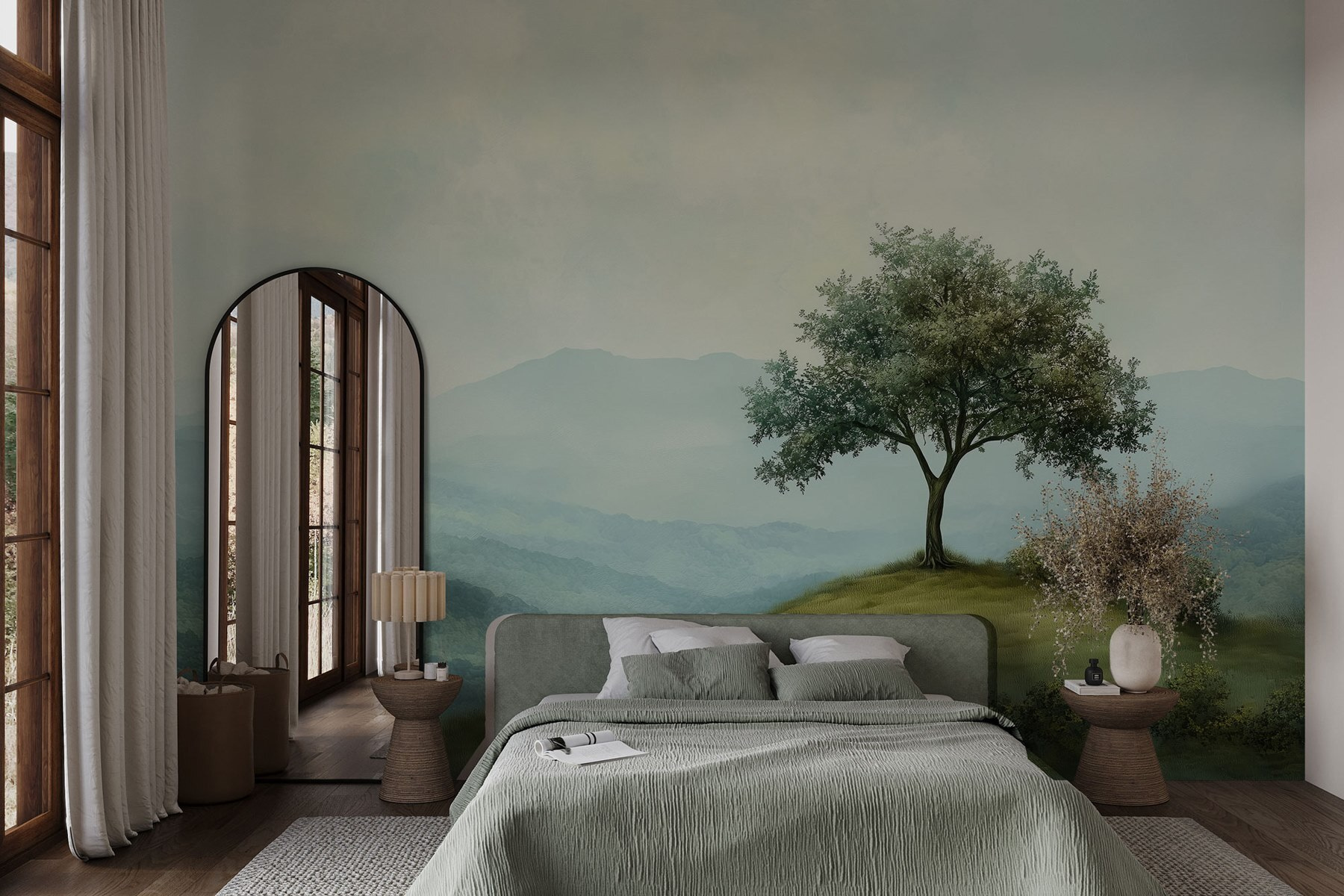 Imagine entrar numa sala acolhedora e sentir instantaneamente uma onda de calma a tomar conta de si. Essa é a magia do “Papel de parede Tree on a Hill”. Esta bela peça capta uma árvore serena sentada graciosamente numa colina suave, com montanhas ondulantes a embalá-la ao fundo. É como trazer um pedaço de natureza pacífica para dentro de casa, sem os mosquitos!
