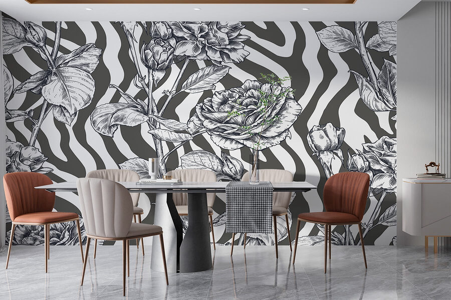 Transforme as suas paredes num deslumbrante banquete visual com este mural de rosas a preto e branco. É como ter um jardim que nunca murcha, sem o regador e os insectos ocasionais. As flores delicadas dançam sobre um fundo elegante e às riscas, acrescentando um pouco de vantagem sem exagerar. Imagine-se a beber o seu café da manhã ou a enrolar-se com um livro, tudo isto rodeado por esta elegante beleza floral. Quer seja para uma sala de estar acolhedora ou para um escritório com estilo, este mural traz um toque de encanto da natureza com um toque moderno. Perfeito para quem deseja um toque de personalidade – não são necessários dedos verdes!