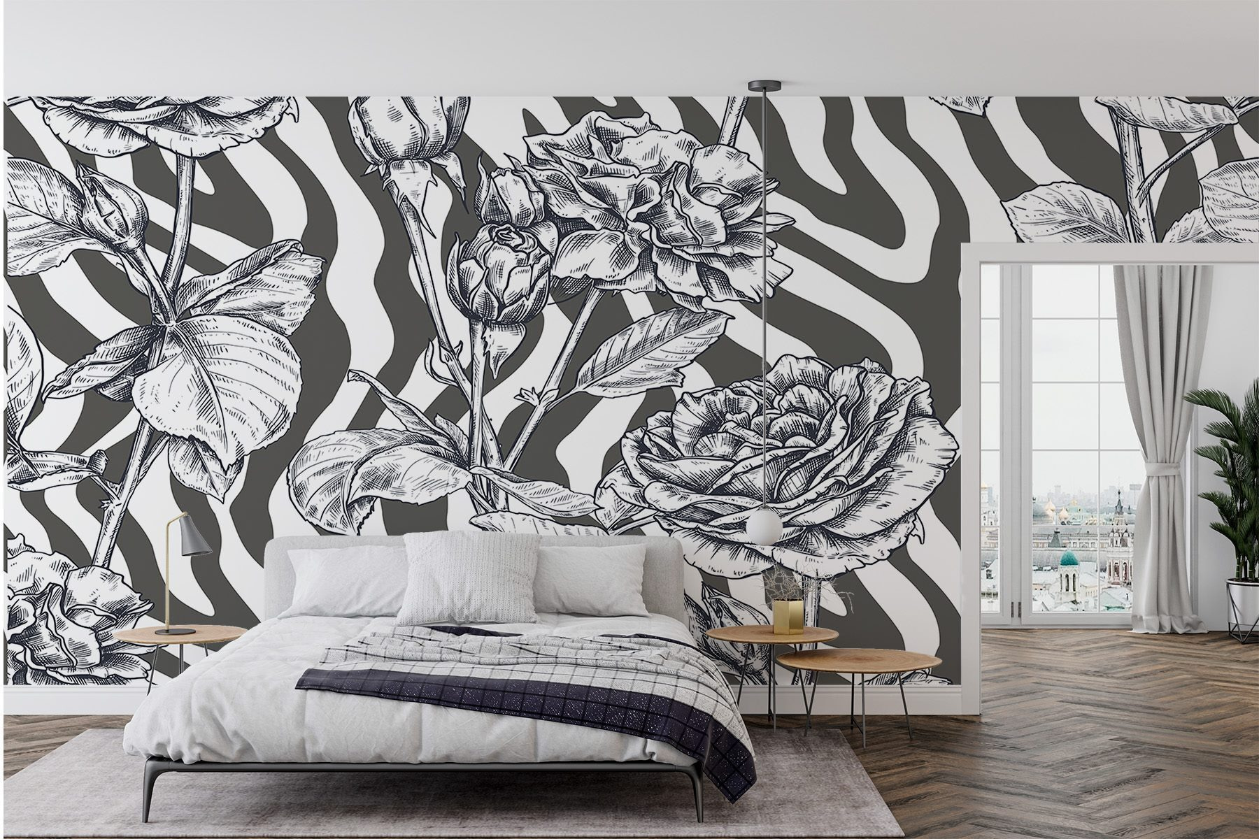Transforme as suas paredes num deslumbrante banquete visual com este mural de rosas a preto e branco. É como ter um jardim que nunca murcha, sem o regador e os insectos ocasionais. As flores delicadas dançam sobre um fundo elegante e às riscas, acrescentando um pouco de vantagem sem exagerar. Imagine-se a beber o seu café da manhã ou a enrolar-se com um livro, tudo isto rodeado por esta elegante beleza floral. Quer seja para uma sala de estar acolhedora ou para um escritório com estilo, este mural traz um toque de encanto da natureza com um toque moderno. Perfeito para quem deseja um toque de personalidade – não são necessários dedos verdes!