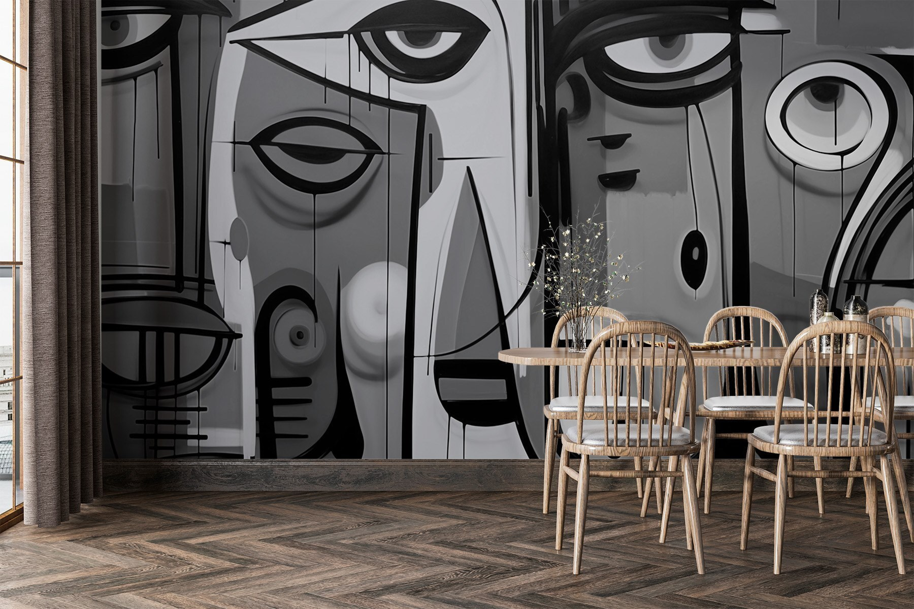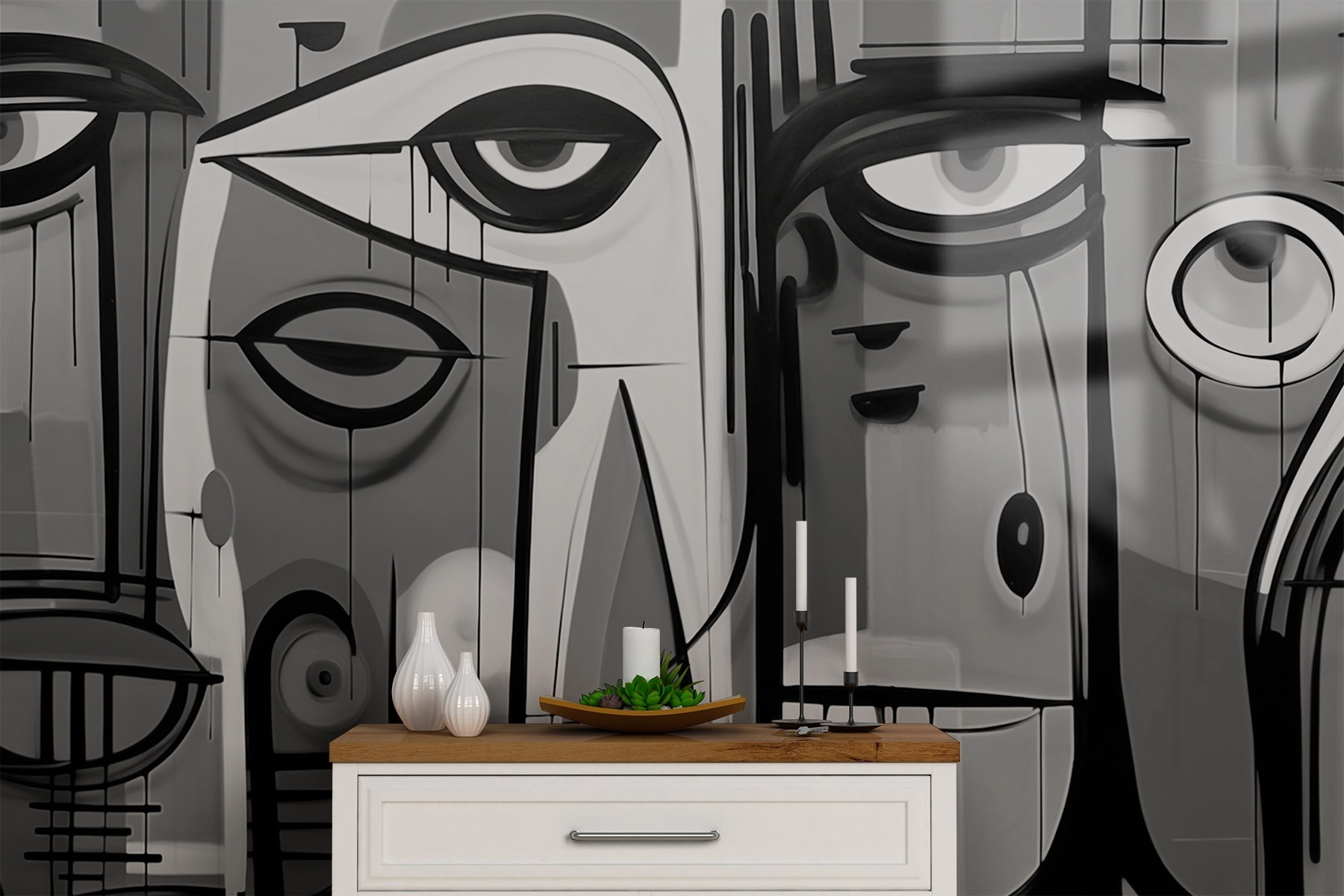 Transforme o seu espaço com este impressionante mural de parede a preto e branco, com rostos cativantes que parecem espreitar para o seu mundo. É como ter uma conversa com a arte – cheia de emoção e intriga. Imagine isto: entra no seu quarto e pimba! Estes rostos expressivos atraem-no, despertando curiosidade e talvez até um sorriso. Perfeito para uma sala de estar ou um recanto criativo, acrescenta uma camada de profundidade sem todas as cores a disputar a atenção. Além disso, é um fantástico quebra-gelo para todos os que passam por cá. Quem não gostaria de refletir sobre as histórias por detrás daqueles olhares intensos? Perfeitamente contemporâneo e chique sem esforço!