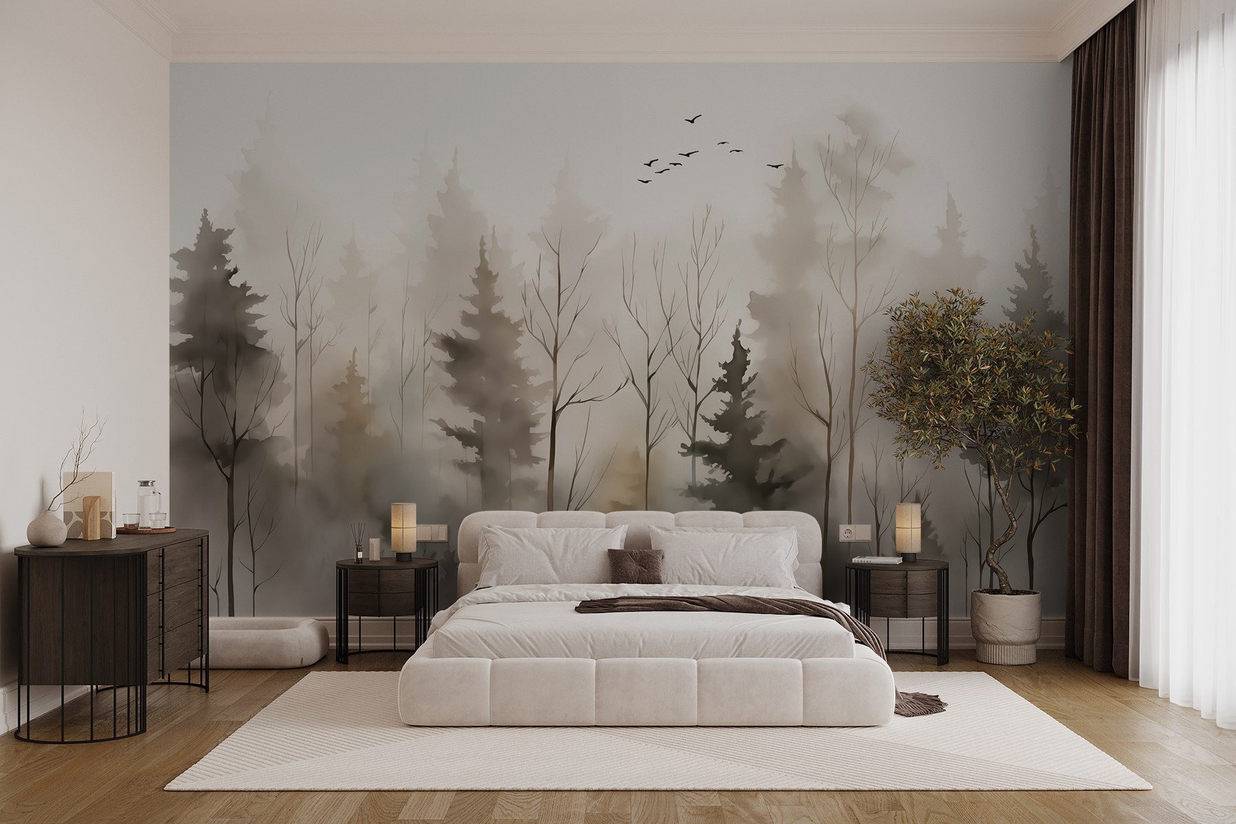 Transforme qualquer espaço numa serena fuga da floresta com o mural “Grupo de Árvores no Nevoeiro”. Imagine-se a aconchegar-se na sua sala de estar, com os tons suaves e discretos a convidá-lo a descontrair após um longo dia. Este mural sussurra calma, envolvendo as suas paredes na beleza delicada da natureza – menos os mosquitos, claro!