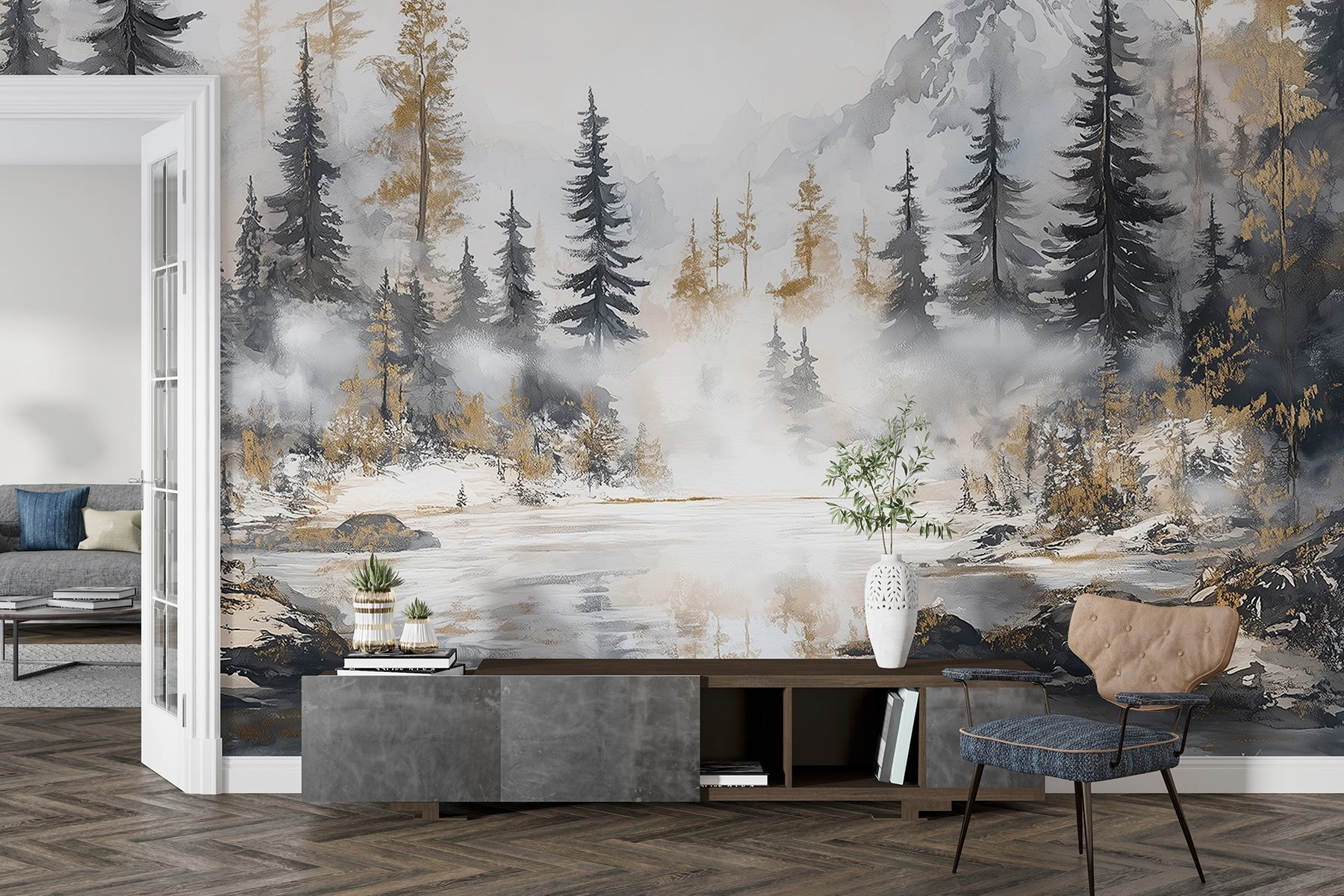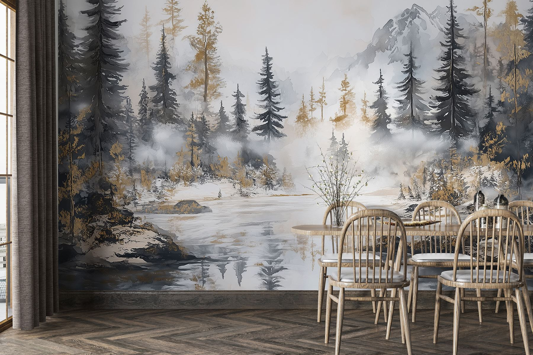 Transforme o seu espaço numa fuga serena com este deslumbrante mural de aguarela de uma floresta e montanhas. É como trazer a calma da natureza para dentro de casa, sem as picadas de insectos e os sapatos enlameados. Imagine noites aconchegantes passadas junto à “lareira” (ou apenas uma vela bruxuleante) enquanto contempla as árvores enevoadas e os picos imponentes – quem precisa de uma bota de caminhada quando tem esta beleza na parede? Perfeito para uma sala de estar ou para um recanto de leitura tranquilo, este mural sussurra relaxamento. É um lembrete artístico para respirar fundo e deixar a natureza fazer a sua magia, mesmo em sua casa.