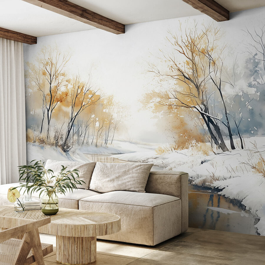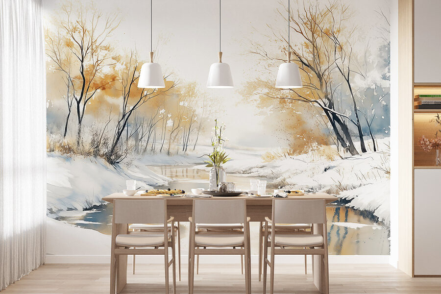 Imagine entrar num país das maravilhas nevado sempre que entra no seu quarto. Este mural “Papel de parede River with Snow and Trees” capta essa vibração serena como um cobertor acolhedor num dia frio. Tons suaves de aguarela misturam-se suavemente, criando uma cena pacífica de rio emoldurada por árvores delicadas, todas polvilhadas com uma camada de neve.