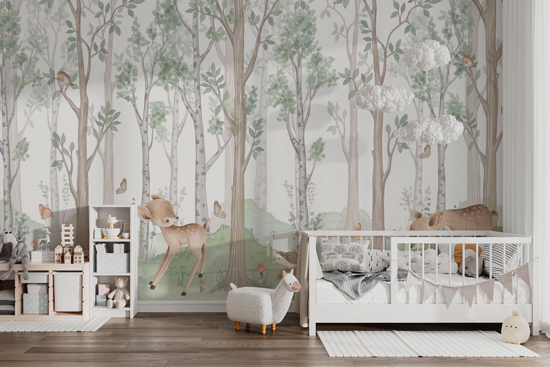 Transforme qualquer divisão numa fuga serena da floresta com este mural de parede encantador. Imagine: um espaço acolhedor onde os veados se pavoneiam suavemente, os coelhinhos curiosos saltam e os pássaros fazem uma serenata nas copas das árvores. É como trazer uma fatia da natureza para dentro de casa sem as botas enlameadas! Os tons suaves e as criaturas extravagantes tornam-no perfeito para infantários, salas de jogos ou mesmo para um recanto de leitura tranquilo. Imagine-se a enrolar-se com um livro enquanto as borboletas passam a voar. O mural sussurra calma, lembrando-nos de passeios na floresta, onde as preocupações se desvanecem e reina a tranquilidade. Perfeito para os amantes da natureza, é uma forma encantadora de acrescentar carácter e encanto à sua casa – quem não quereria isso?