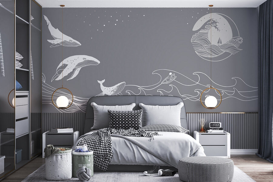 Mergulhe num mundo de capricho com este mural que apresenta uma baleia majestosa e um homem solitário a navegar no oceano. É como se uma onda suave de calma invadisse a sala, recordando a todos as vastas aventuras da vida. Imagine-se a beber chá enquanto olha para estas graciosas baleias – não é uma alegria? Os tons suaves e as linhas fluidas criam uma atmosfera serena, perfeita para sonhar acordado com escapadelas na praia ou noites aconchegantes. É uma deliciosa dança da natureza que fará com que todos os convidados perguntem onde encontrou uma peça tão encantadora!
