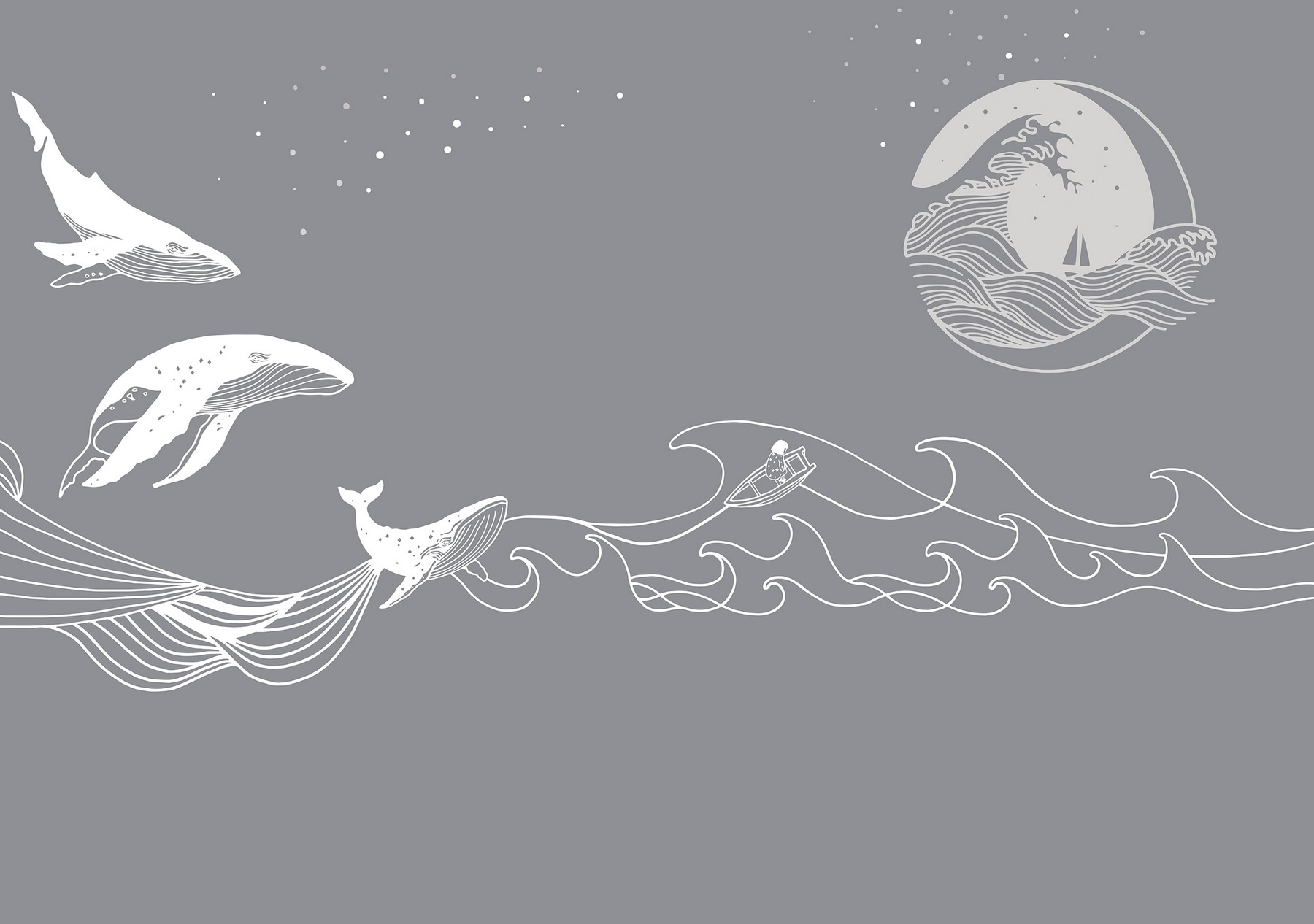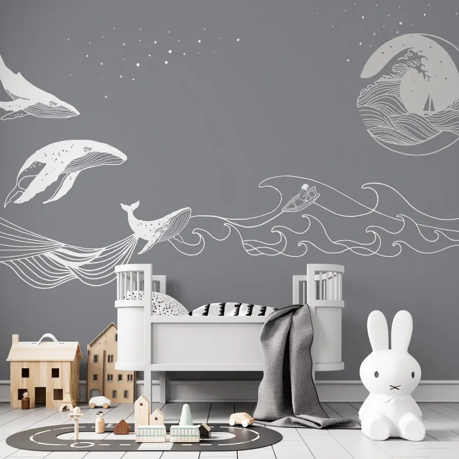 Mergulhe num mundo de capricho com este mural que apresenta uma baleia majestosa e um homem solitário a navegar no oceano. É como se uma onda suave de calma invadisse a sala, recordando a todos as vastas aventuras da vida. Imagine-se a beber chá enquanto olha para estas graciosas baleias – não é uma alegria? Os tons suaves e as linhas fluidas criam uma atmosfera serena, perfeita para sonhar acordado com escapadelas na praia ou noites aconchegantes. É uma deliciosa dança da natureza que fará com que todos os convidados perguntem onde encontrou uma peça tão encantadora!