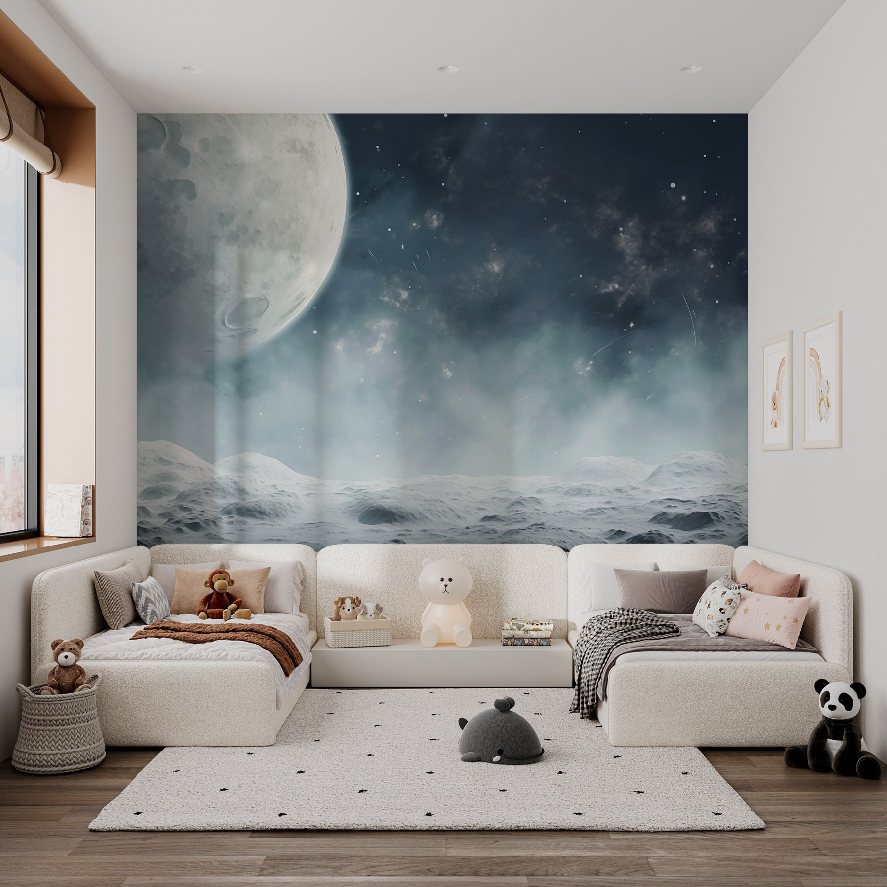 Transforme qualquer divisão numa fuga de sonho com os “Fotomurais Moon in the Sky”. Imagine-se a olhar para uma lua enorme rodeada de nuvens suaves e estrelas cintilantes. É o tipo de mural que o faz parar, respirar e sentir-se um pouco maravilhado. Perfeito para um recanto de leitura acolhedor ou para um quarto relaxante, este mural capta sem esforço aquela vibração serena do céu noturno. Um olhar, e é como ser transportado para uma noite estrelada. É também um início de conversa – os amigos podem até perguntar se tem um telescópio escondido. Por isso, quer seja uma noite de cinema ou uma noite tranquila, este mural acrescenta um toque de magia às paredes comuns. Quem não gostaria de ter um pouco de luar em casa?