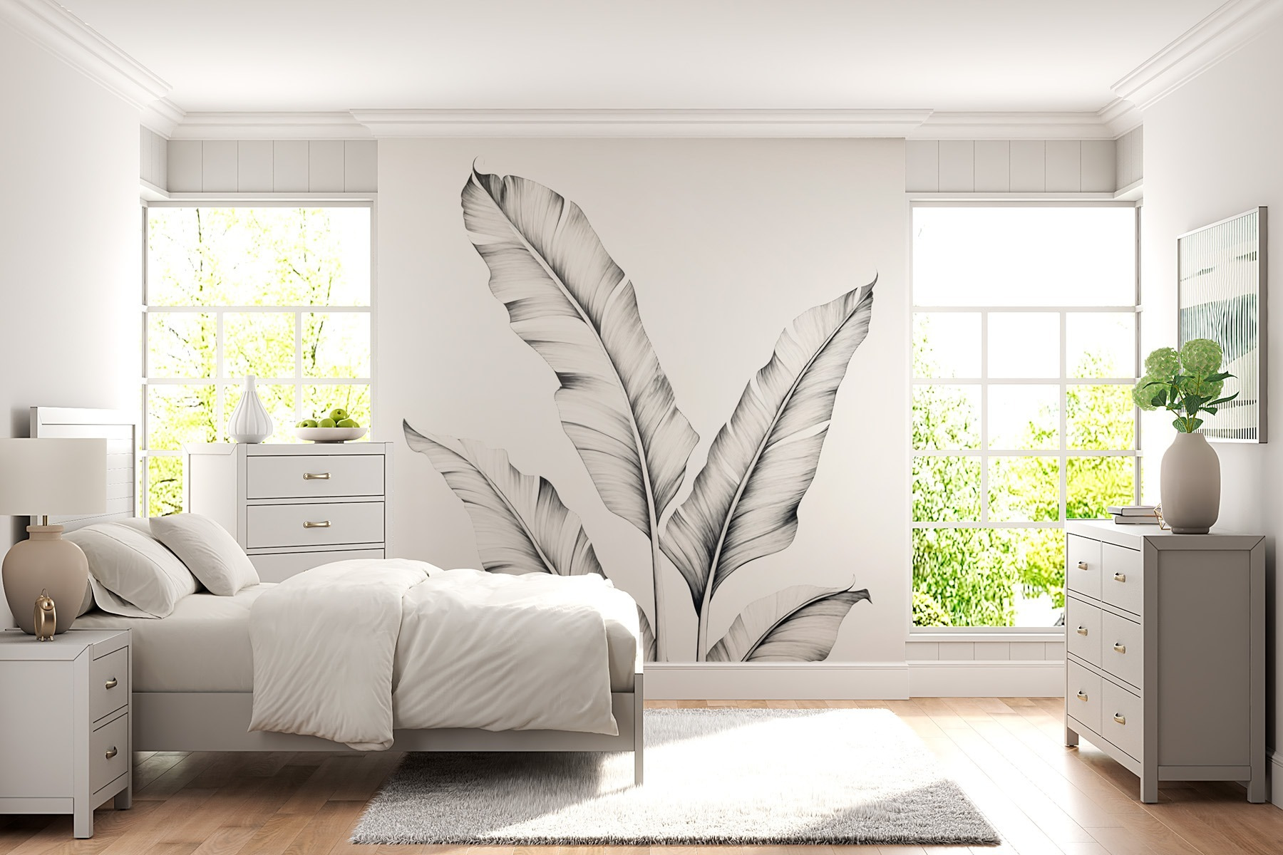 Transforme qualquer divisão numa fuga serena com este mural de parede com desenhos de plantas deslumbrantes. Imagine entrar no seu espaço e sentir-se como se tivesse entrado num paraíso tropical – sem sair do seu sofá, claro. As linhas elegantes das folhas balançam suavemente, criando uma sensação de calma e ligação à natureza.