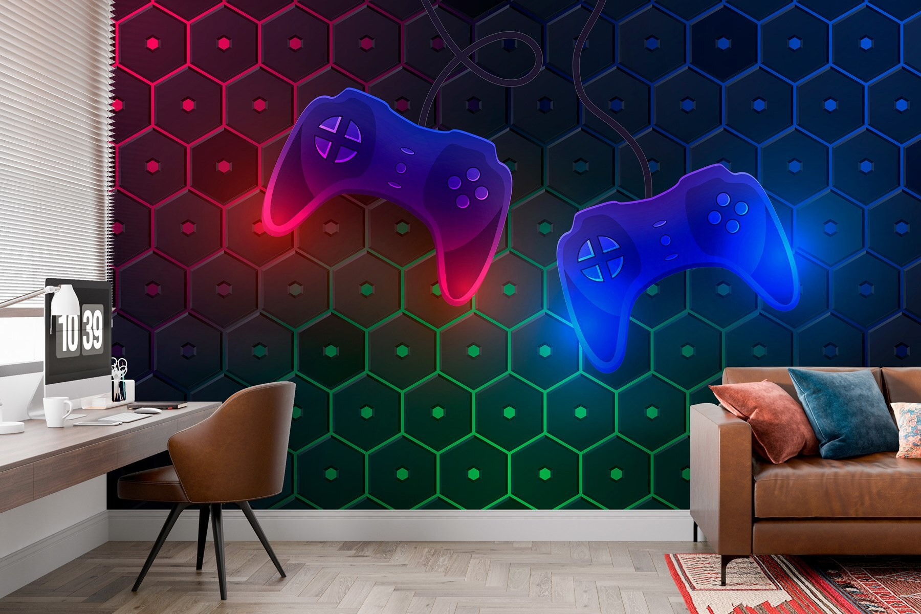 Transforme o seu espaço com uma explosão de criatividade! Este mural de parede hipnotizante, com comandos de jogos vibrantes num fundo hexagonal, é como um convite lúdico para mergulhar no mundo dos jogos. Imagine-se a conviver com amigos, com risos a ecoar enquanto se desafiam uns aos outros, tudo sob o brilho desses comandos coloridos. Não se trata apenas de decoração; é uma vibração – um início de conversa divertido que traz energia a qualquer divisão. A mistura de cores arrojadas e padrões geométricos dá um toque moderno que mantém as coisas frescas. Perfeito para cavernas de jogadores, quartos de crianças ou qualquer espaço que deseje uma pitada de personalidade. Vai dar por si a sorrir sempre que passar por ele – é quase como se o mural o desafiasse para uma desforra!