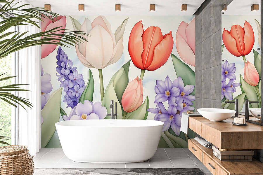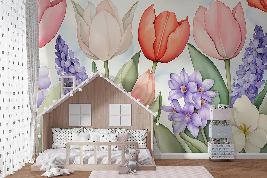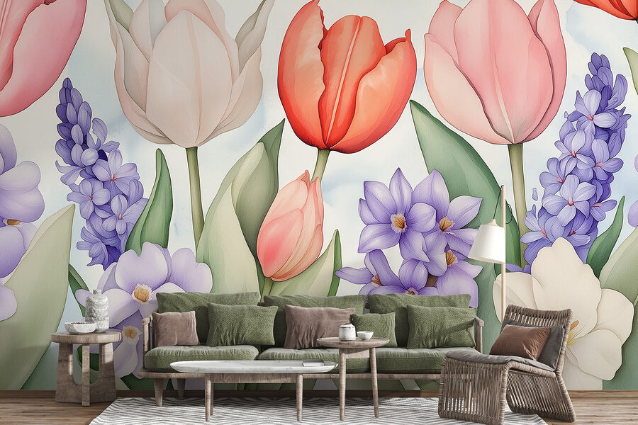 Imagine entrar numa sala que parece primavera durante todo o ano. Este mural encantador, repleto de flores vibrantes e folhas exuberantes, faz exatamente isso! Com a sua deslumbrante variedade de tulipas e flores delicadas, é como ter um mini-jardim mesmo na sua parede. As cores suaves transmitem uma sensação de calma, tornando-a perfeita para um recanto de leitura acolhedor ou para uma sala de estar animada. Os convidados vão sentir aquela vibração calorosa e acolhedora e talvez até vão à procura da loja de flores mais próxima! E é uma óptima maneira de impressionar os amigos sem o incómodo de regar nada. Quer seja um fanático por flores ou apenas adore um toque de cor, este mural tem tudo o que precisa!