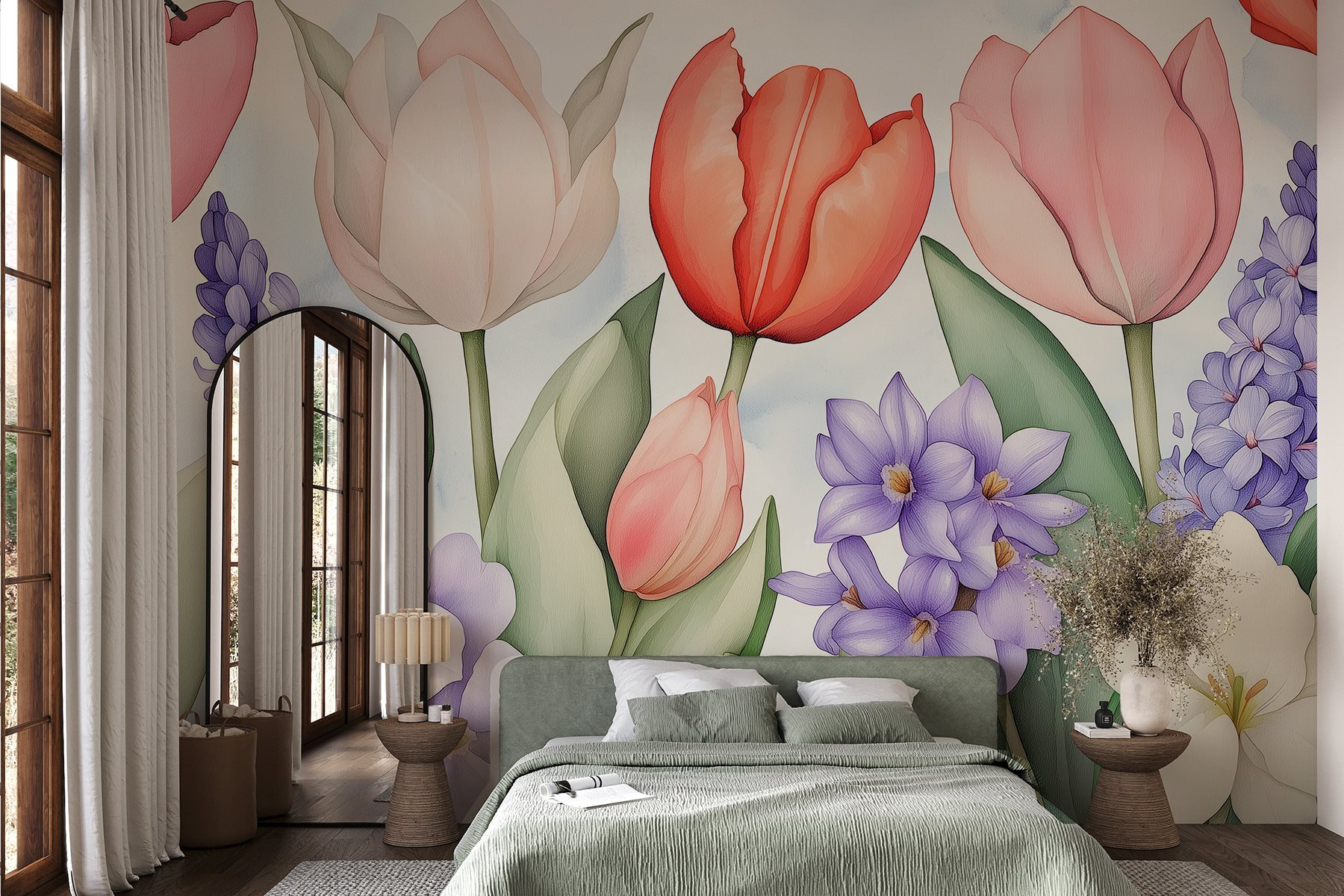 Imagine entrar numa sala que parece primavera durante todo o ano. Este mural encantador, repleto de flores vibrantes e folhas exuberantes, faz exatamente isso! Com a sua deslumbrante variedade de tulipas e flores delicadas, é como ter um mini-jardim mesmo na sua parede. As cores suaves transmitem uma sensação de calma, tornando-a perfeita para um recanto de leitura acolhedor ou para uma sala de estar animada. Os convidados vão sentir aquela vibração calorosa e acolhedora e talvez até vão à procura da loja de flores mais próxima! E é uma óptima maneira de impressionar os amigos sem o incómodo de regar nada. Quer seja um fanático por flores ou apenas adore um toque de cor, este mural tem tudo o que precisa!