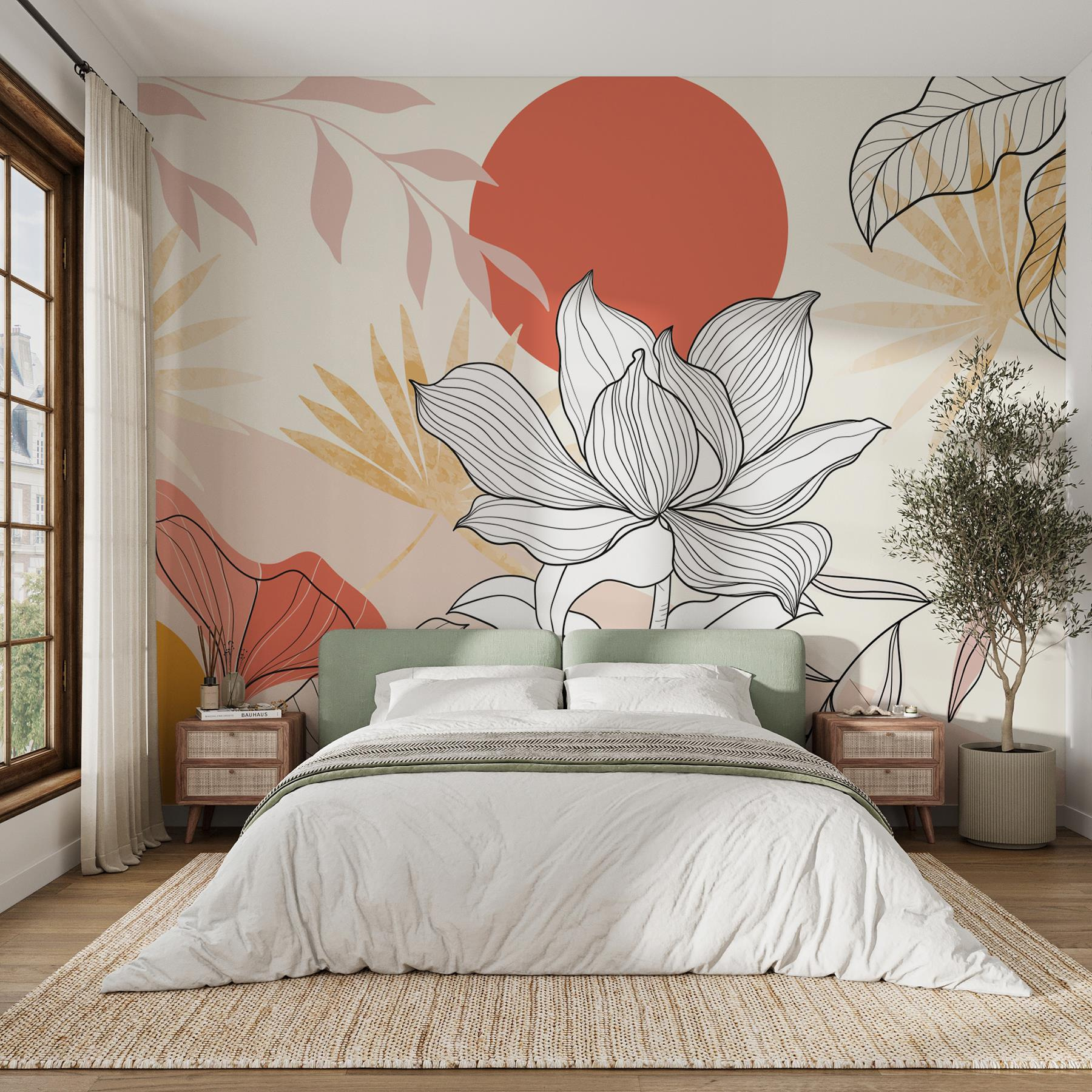 Ilumine as suas paredes com este belo mural com flores e folhas a dançar sob um sol quente e vermelho. É como trazer um pouco do ar livre para dentro de casa – sem os insectos, claro. Imagine isto: beber café enquanto absorve as cores vibrantes; é como umas mini-férias mesmo em casa. A mistura de tons pastel suaves e vermelhos marcantes cria um ambiente acolhedor mas cheio de energia. Chame os seus amigos para uma conversa informal e veja-os animarem-se enquanto admiram a arte. Perfeito para qualquer divisão que precise de uma pitada de personalidade. Quem não gostaria de uma fuga botânica?