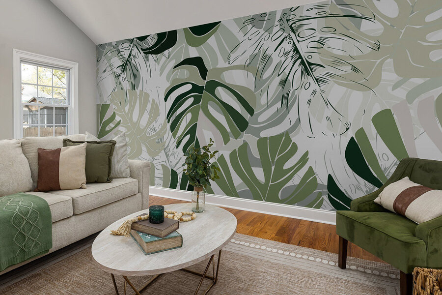 Transforme uma parede simples numa fuga vibrante com este belo mural com padrão de folhas. Imagine isto: o sol a entrar pela sua janela, com estas folhas verdes exuberantes a dançar num fundo branco e nítido. É como uma selva interior sem os insectos irritantes! Este design acrescenta uma vibração refrescante a qualquer divisão – perfeito para um recanto de leitura acolhedor ou para iluminar aquele corredor aborrecido. Imagine-se a beber café rodeado por esta folhagem alegre, sentindo-se um pouco como se estivesse numa escapadela tropical. É convidativo, fresco e exala o encanto da natureza. Prepare-se para dar vida ao seu espaço!