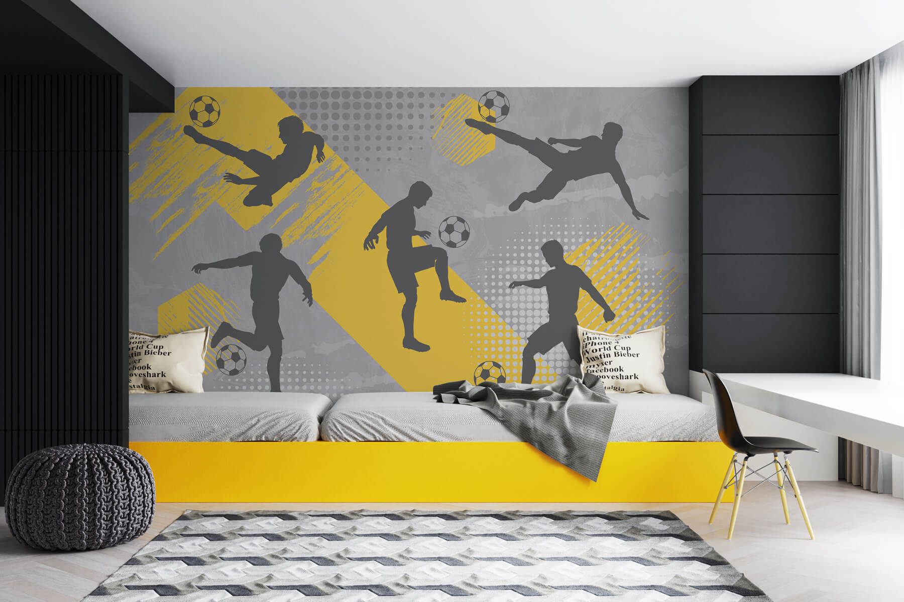 Transforme uma parede simples numa cena dinâmica com este mural vibrante de homens a jogar futebol. É como ter o seu próprio mini-estádio em casa. As silhuetas, cheias de energia, capturam aquele momento perfeito de um pontapé, um salto e toda a emoção do jogo. Imagine entrar no seu quarto e sentir aquela adrenalina, como se estivesse prestes a se juntar aos jogadores em campo. Com amarelos marcantes contra cinzas suaves, ele adiciona um toque de alegria, tornando qualquer espaço mais vivo. Perfeito para entusiastas do esporte ou qualquer pessoa que goste de um pouco de entusiasmo na decoração. Prepare-se para chutar o tédio para longe!