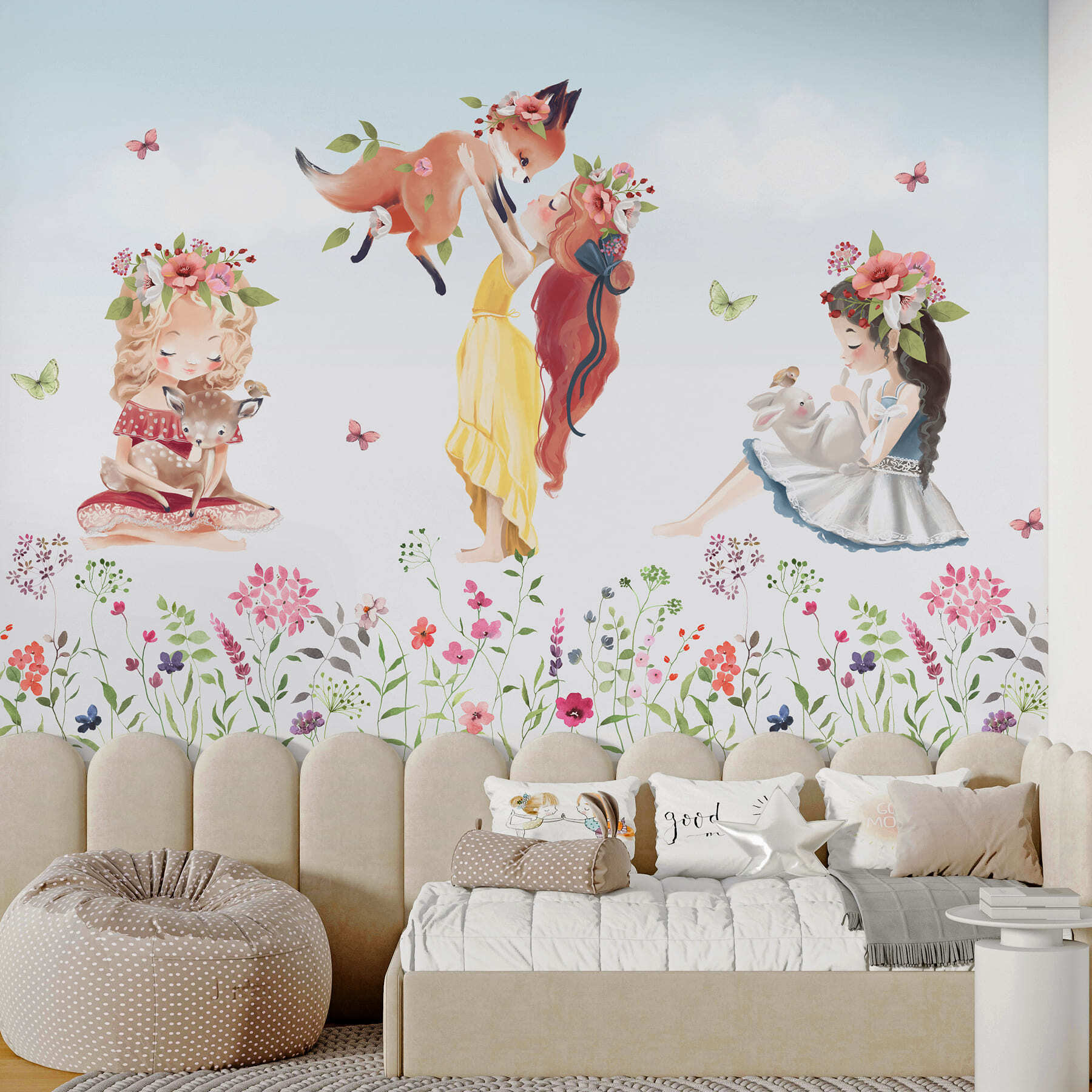 Transforme qualquer espaço com este mural de parede encantador que apresenta um grupo encantador de raparigas emparelhadas com animais adoráveis no meio de um vibrante campo de flores. Imagine as gargalhadas e os gritos de alegria que este mural proporciona, tornando-o o cenário perfeito para momentos de brincadeira. Cada rapariga, com o seu estilo único e o seu companheiro fofinho, capta um espírito caprichoso que dá a sensação de entrar num livro de histórias. Não se trata apenas de decoração; convida à imaginação e ao espanto. Acrescentando um toque de magia, este mural é uma afirmação encantadora nos quartos das crianças ou nas áreas de lazer, criando um oásis convidativo cheio de cor e calor. Uma recordação radiante de dias despreocupados passados ao ar livre, irá certamente suscitar conversas sinceras e doces recordações.