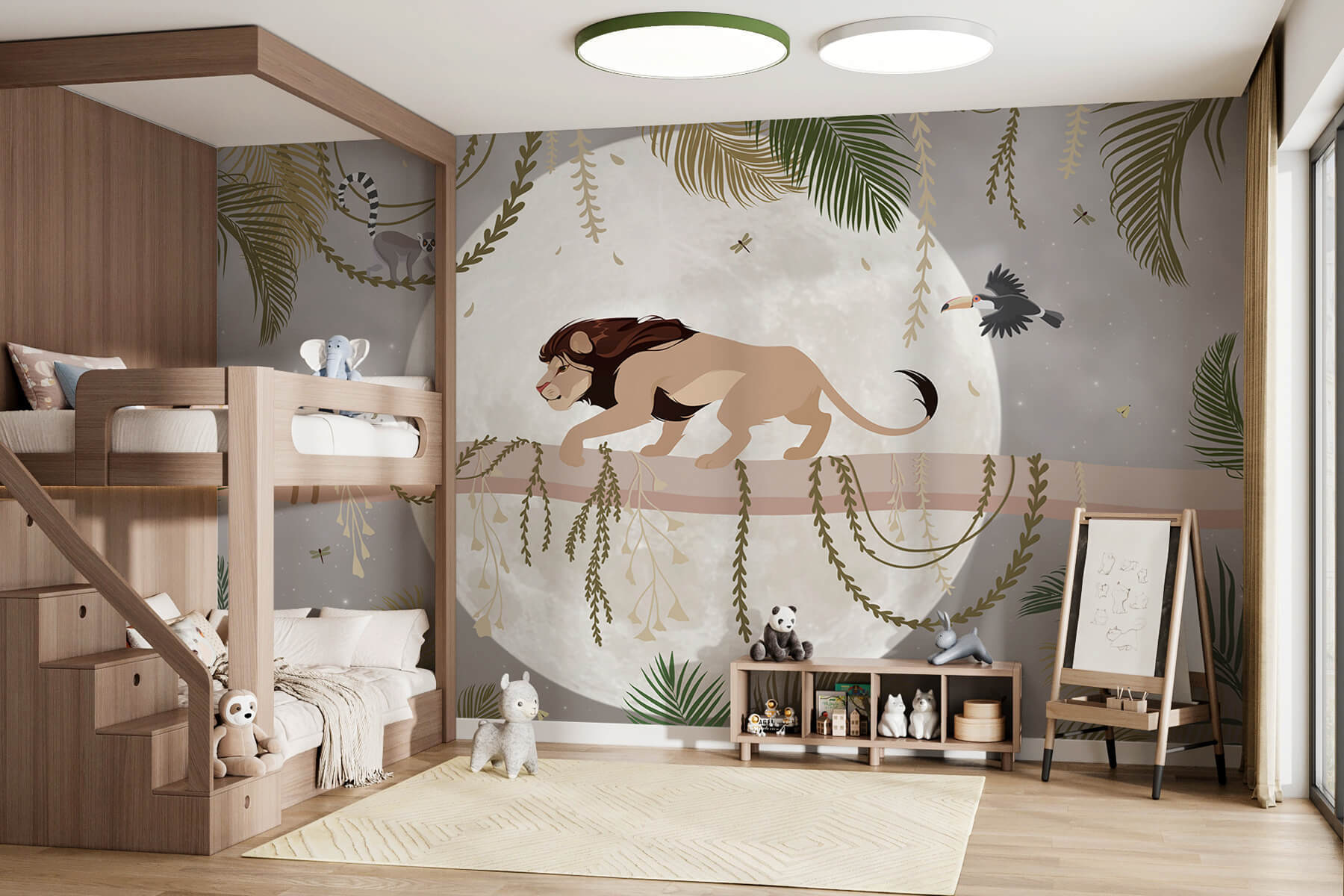 Introducing a mural that’s all about wild charm—meet the “Lion on a Tree Branch.” Imagine this regal creature strutting confidently across a branch, framed by swaying leaves and a dreamy moon. It’s like bringing a piece of the tropics right into your living room. Every glance delivers a splash of adventure, don’t you think?