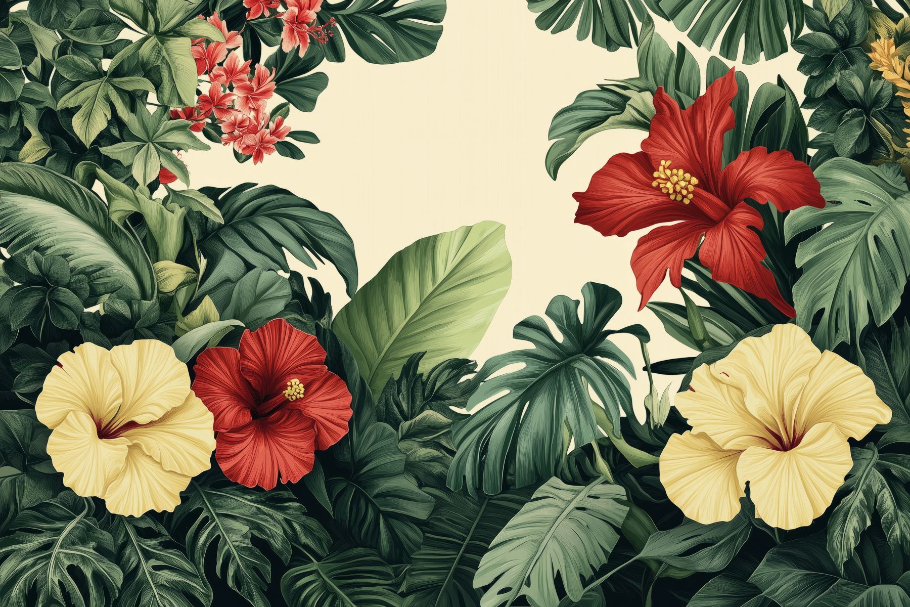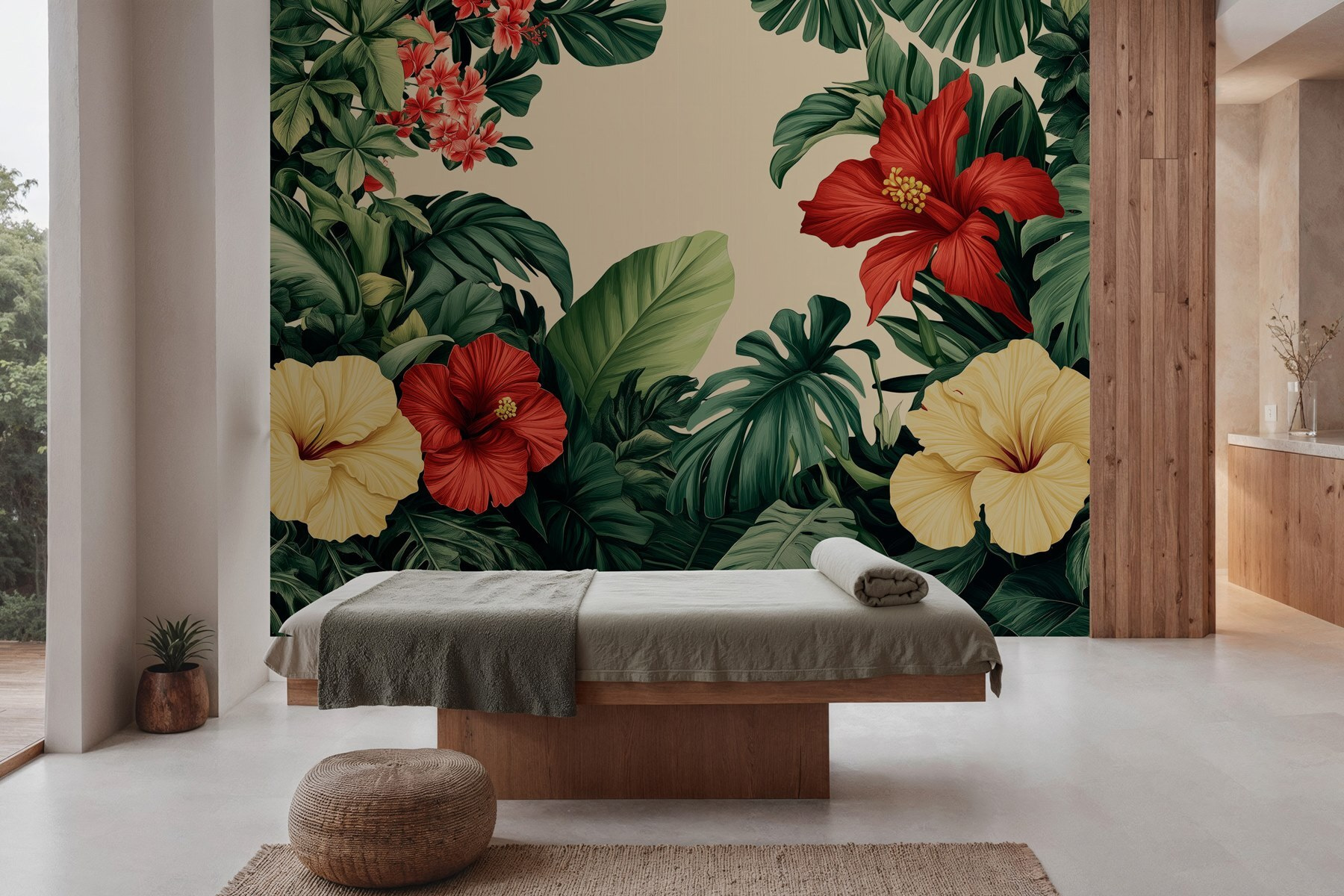 Transforme qualquer divisão numa escapadela tropical com este impressionante mural de parede que exibe um vibrante conjunto de flores e folhas exuberantes. Imagine entrar no seu espaço e ser recebido por flores de hibisco ousadas e verdes intensos. É como uma mini-férias em casa! Este mural não só acrescenta cor, mas também um espírito animado, perfeito para alegrar a sua sala de estar ou convidar um toque da natureza para um recanto de leitura acolhedor. Imagine-se a saborear uma bebida enquanto se deleita com esta beleza botânica — pura felicidade! Perfeito para quem anseia por um toque de charme ao ar livre sem ter de regar nada.