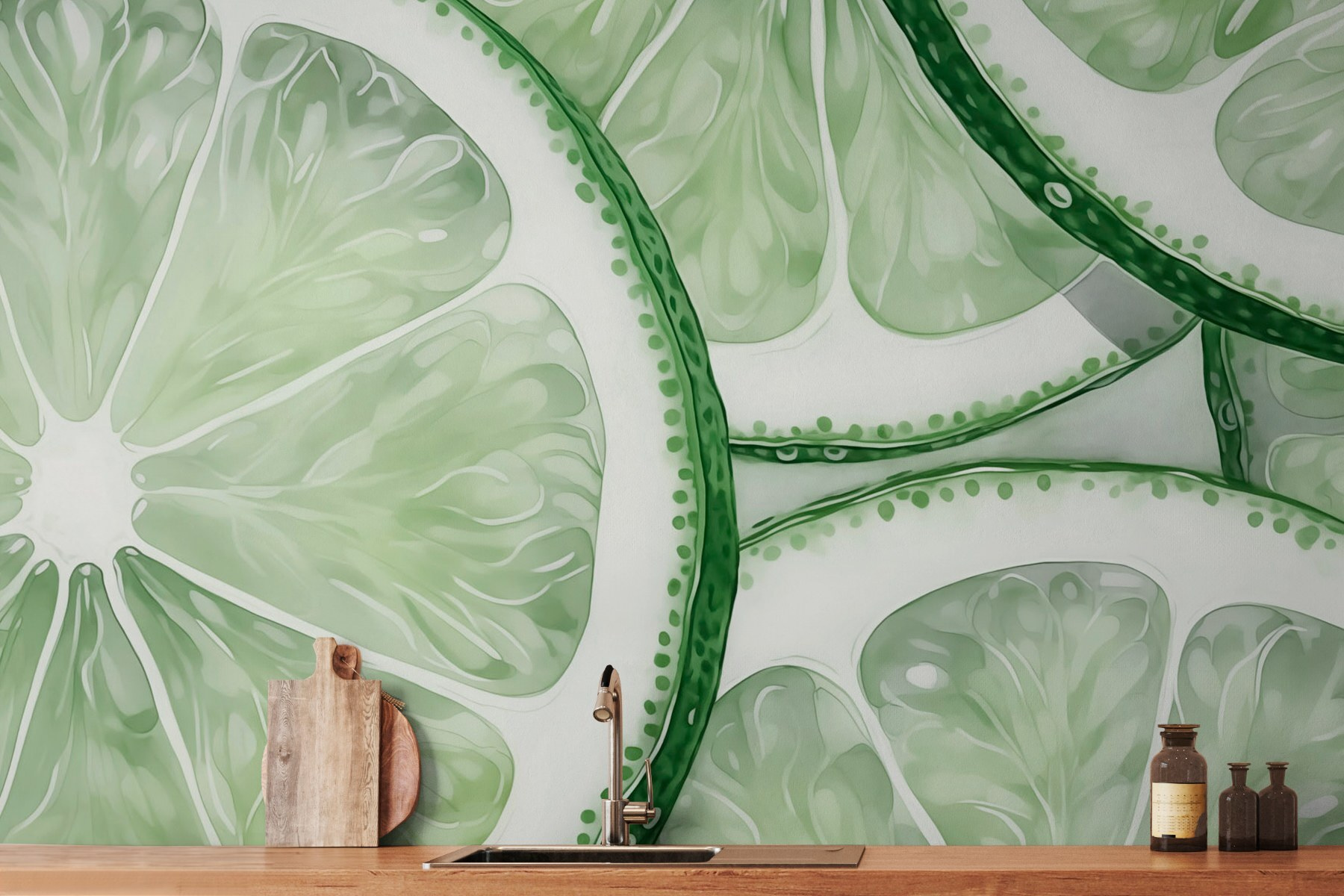 Dê ao seu espaço um toque de entusiasmo com este encantador mural de fatias de lima frescas empilhadas. É brilhante, divertido e ideal para apimentar uma cozinha ou uma área de refeições. Imagine-se a organizar um jantar de festa – cria o cenário para risos, boa comida e talvez até algumas margaritas. Os verdes vibrantes e os detalhes intrincados fazem com que pareça que está a entrar num mercado de fruta. Além disso, há algo de tão refrescante nas limas; acrescentam uma sensação de energia sem serem demasiado intensas. Perfeito para quem acredita no poder de uma atmosfera alegre. Desfrute da explosão de criatividade que este mural traz e veja as suas paredes transformarem-se num animado início de conversa.