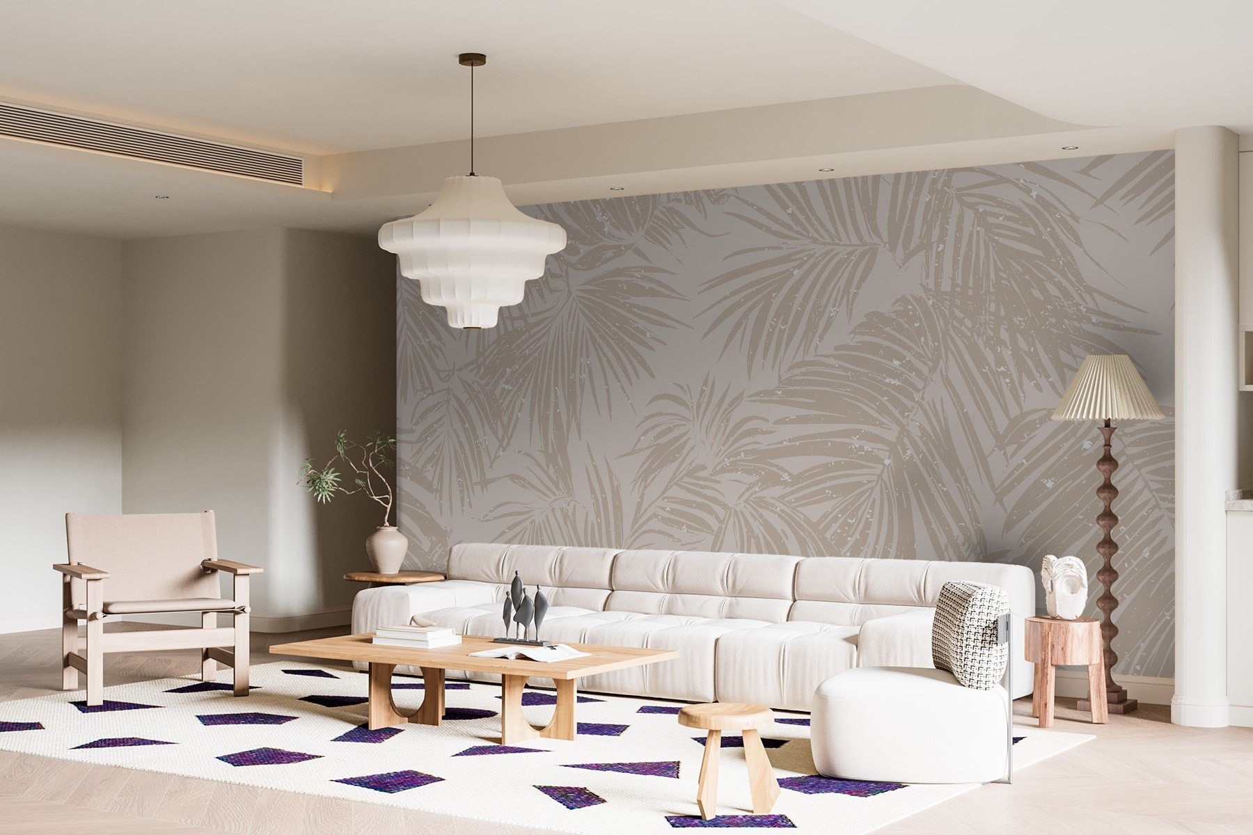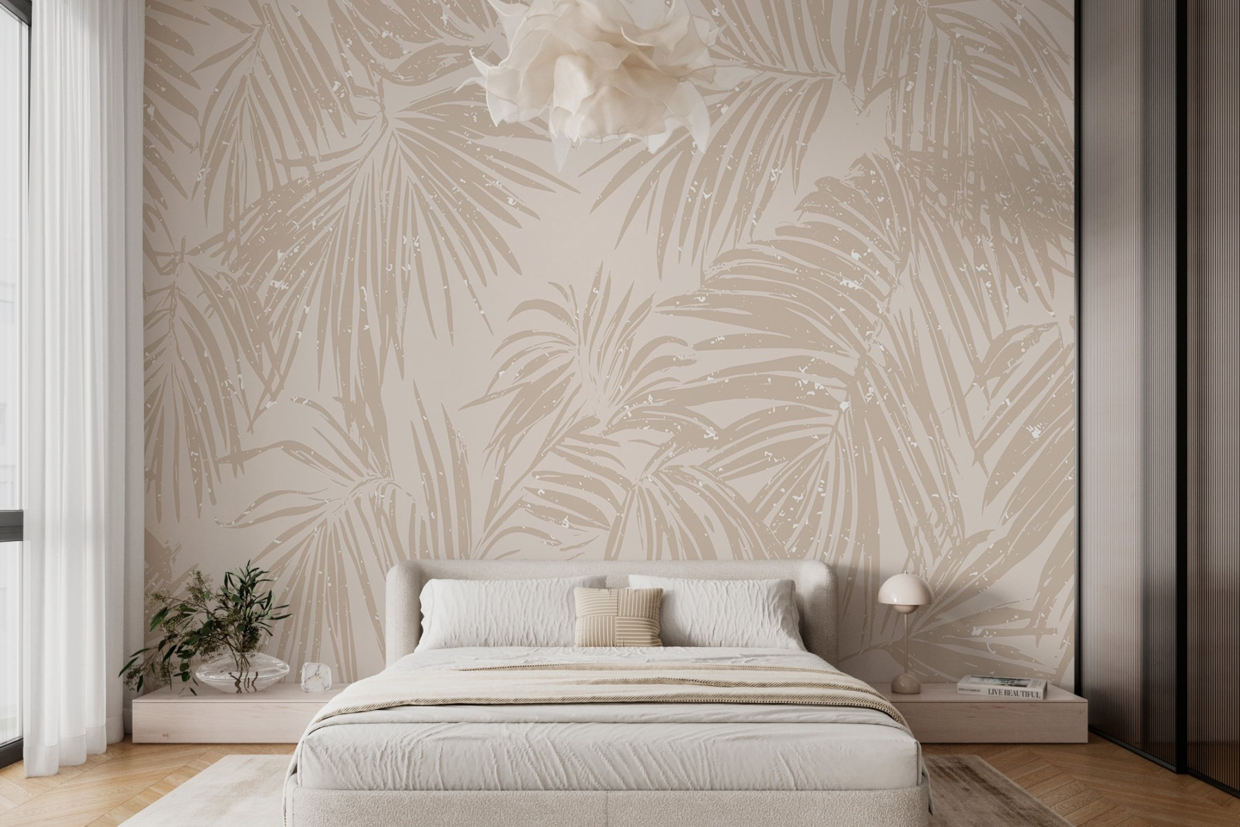 Imagine entrar num oásis sereno mesmo na sua sala de estar. Este mural de parede, com os seus padrões suaves de folhas de palmeira num fundo neutro e suave, convida a vibrações calmas e um toque de charme tropical. Imagine receber amigos e, em vez da conversa habitual, eles ficarem fascinados com as suas paredes deslumbrantes — do tipo: «Onde é que arranjou isto?» Tem a combinação perfeita de elegância e descontração, tornando-o um cenário fabuloso para noites acolhedoras ou brunchs ensolarados. A luz reflete-se nas folhas na medida certa, criando um ambiente tranquilo. É como ter umas mini-férias em casa, sem os bilhetes de avião e o protetor solar! Perfeito para um amante da natureza ou para qualquer pessoa que queira escapar à rotina diária sem sair de casa. Acredite que irá elevar o espaço de uma forma que deixará todos a sentir-se, bem, um pouco mais relaxados.