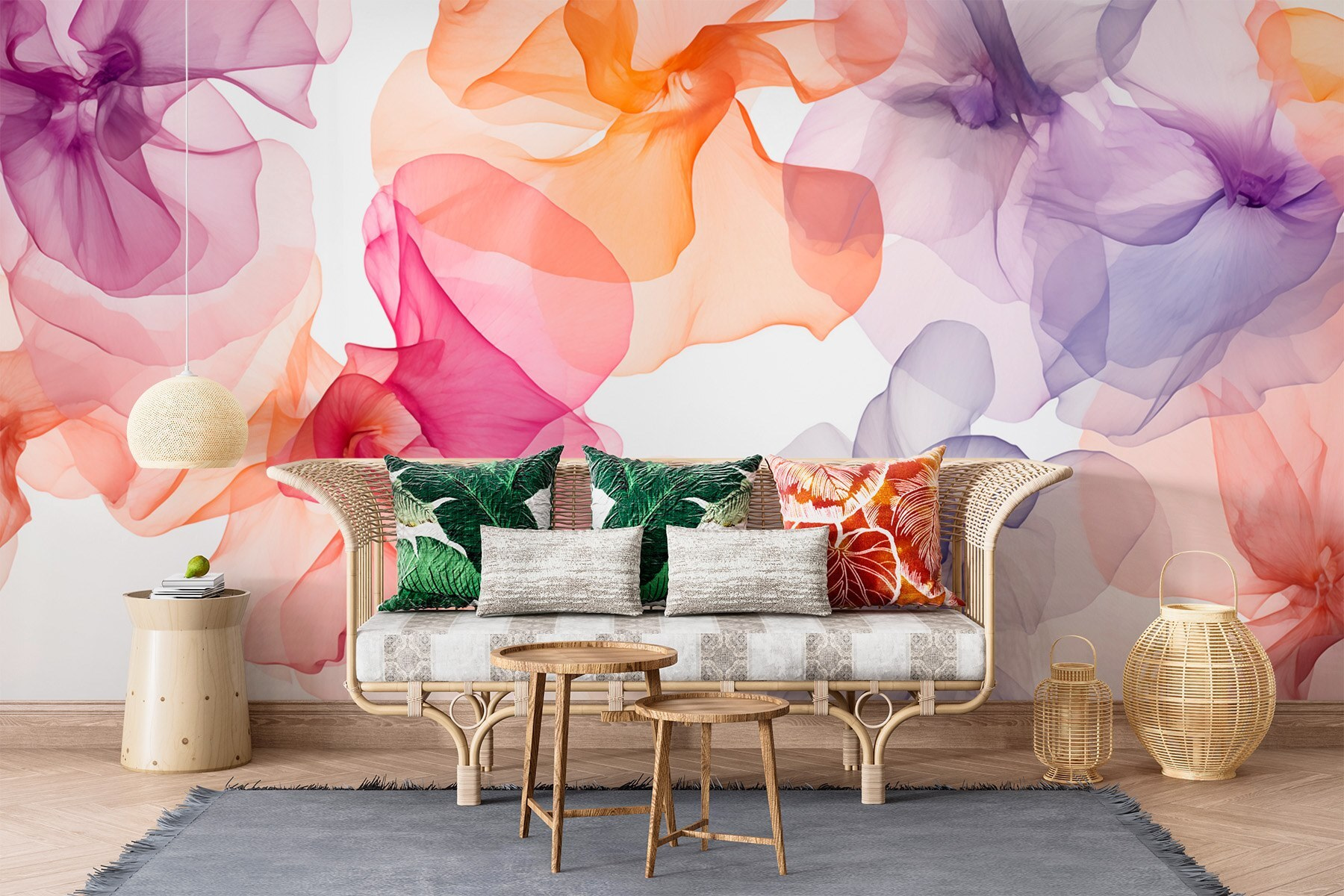 Perfeito para aquelas manhãs aconchegantes com café ou conversas tarde da noite, este mural não apenas decora, ele transforma. As cores dançam suavemente pela parede, tornando o espaço vivo e convidativo. Além disso, é um bom tema para iniciar uma conversa — todos vão querer saber onde você encontrou essa obra-prima. Então vá em frente, deixe este mural trazer um toque de fantasia e calor à sua vida, porque quem não gostaria de viver em uma fantasia floral?