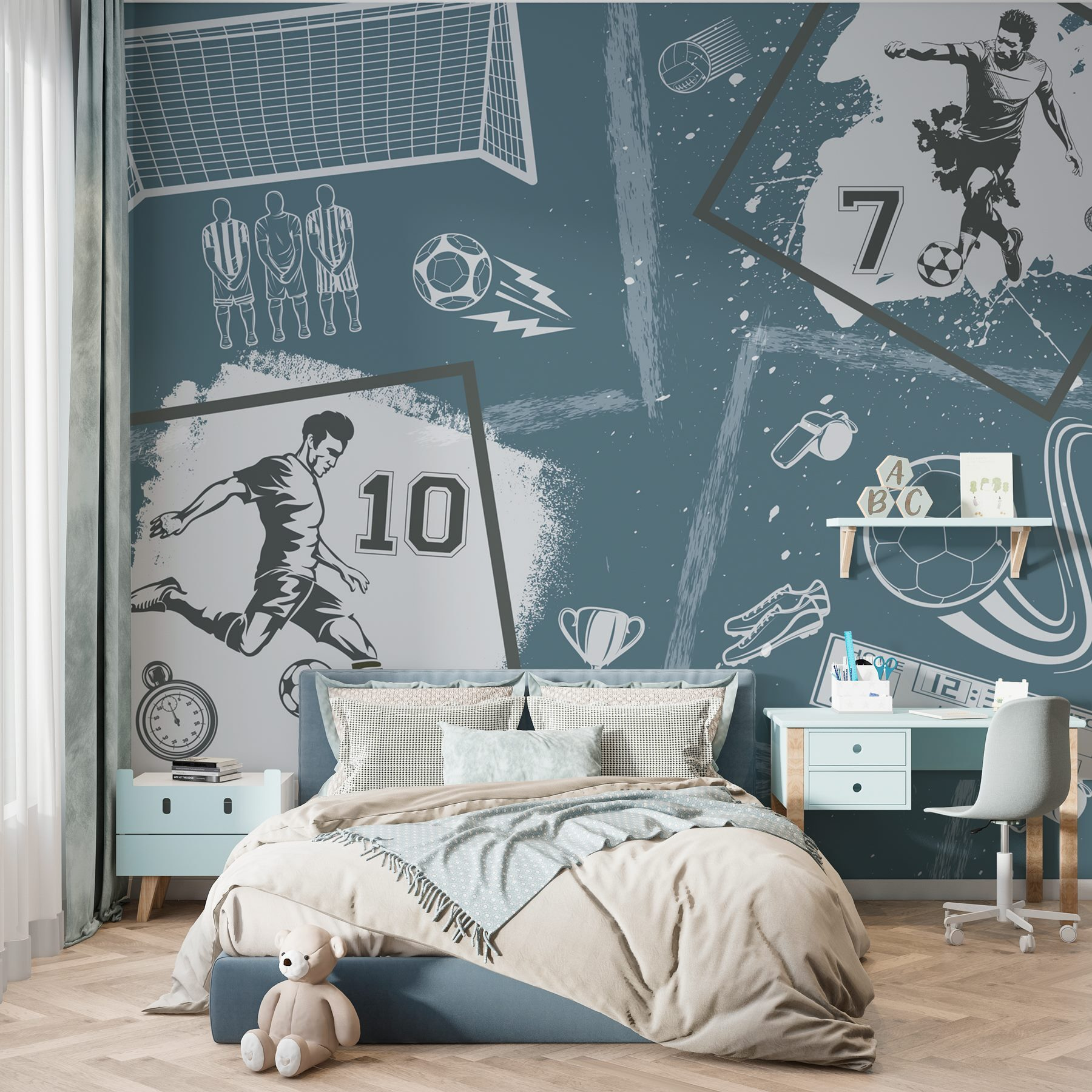 Transform any room into a sports haven with this eye-catching wall mural collage! Bursting with various soccer-themed images, it’s a knockout for fans and dreamers alike. Just picture it—your walls telling stories of epic goals, thrilling match days, and a true love for the game. The combination of dynamic player shots and playful graphics creates an energetic vibe that could ignite anyone’s competitive spirit. It’s like having a mini stadium right at home. Whether it’s game day or a cozy night in, this mural sets the perfect tone for passion and excitement—like that feeling when your favorite team scores and the room erupts in cheers! No doubt, it’ll inspire some friendly rivalries too. Who’s up for a game?