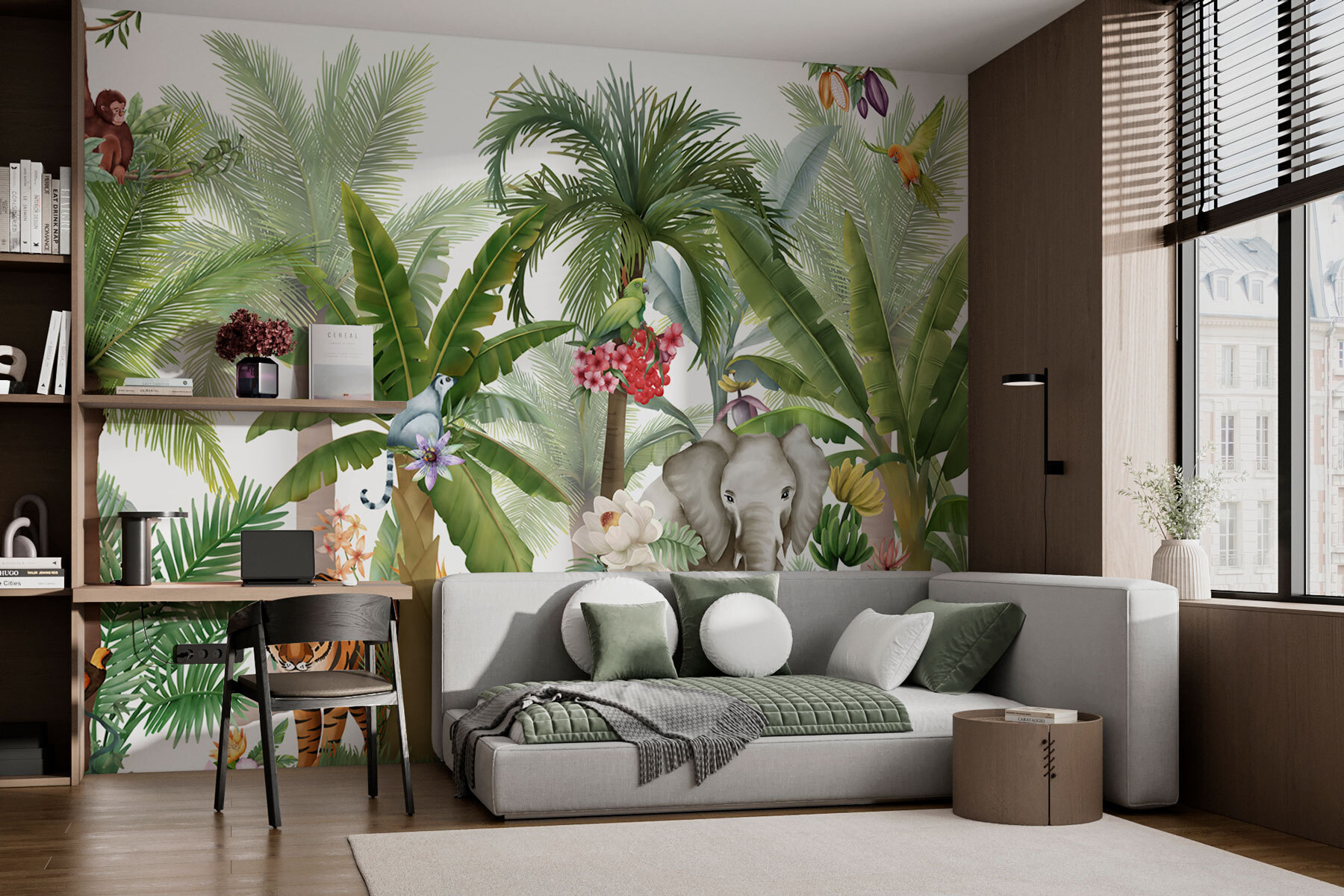 Transforme o seu espaço com este mural vibrante da selva, onde macacos brincalhões balançam e elefantes majestosos vagueiam. É como entrar numa floresta tropical animada, sem as picadas de mosquito! Os verdes exuberantes e os pássaros coloridos criam um cenário que é ao mesmo tempo relaxante e revigorante. Imagine-se a saborear o seu café da manhã enquanto sente o sol quente e a brisa suave — oh, espere, é apenas a sua aconchegante sala de estar! Perfeito para os amantes dos animais, este mural traz a natureza selvagem para dentro de casa, despertando alegria e fazendo com que cada momento pareça uma aventura. Desfrute das vibrações tropicais durante todo o ano!