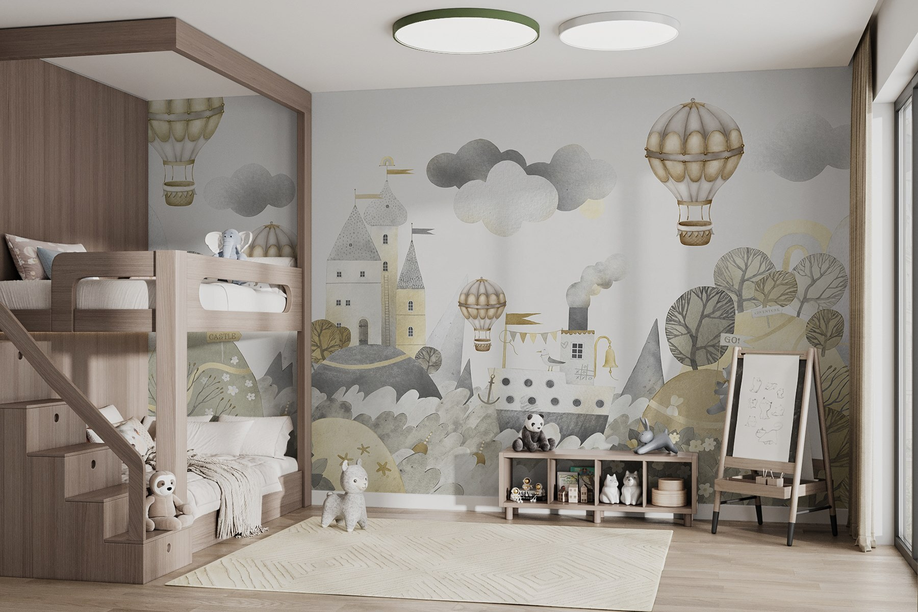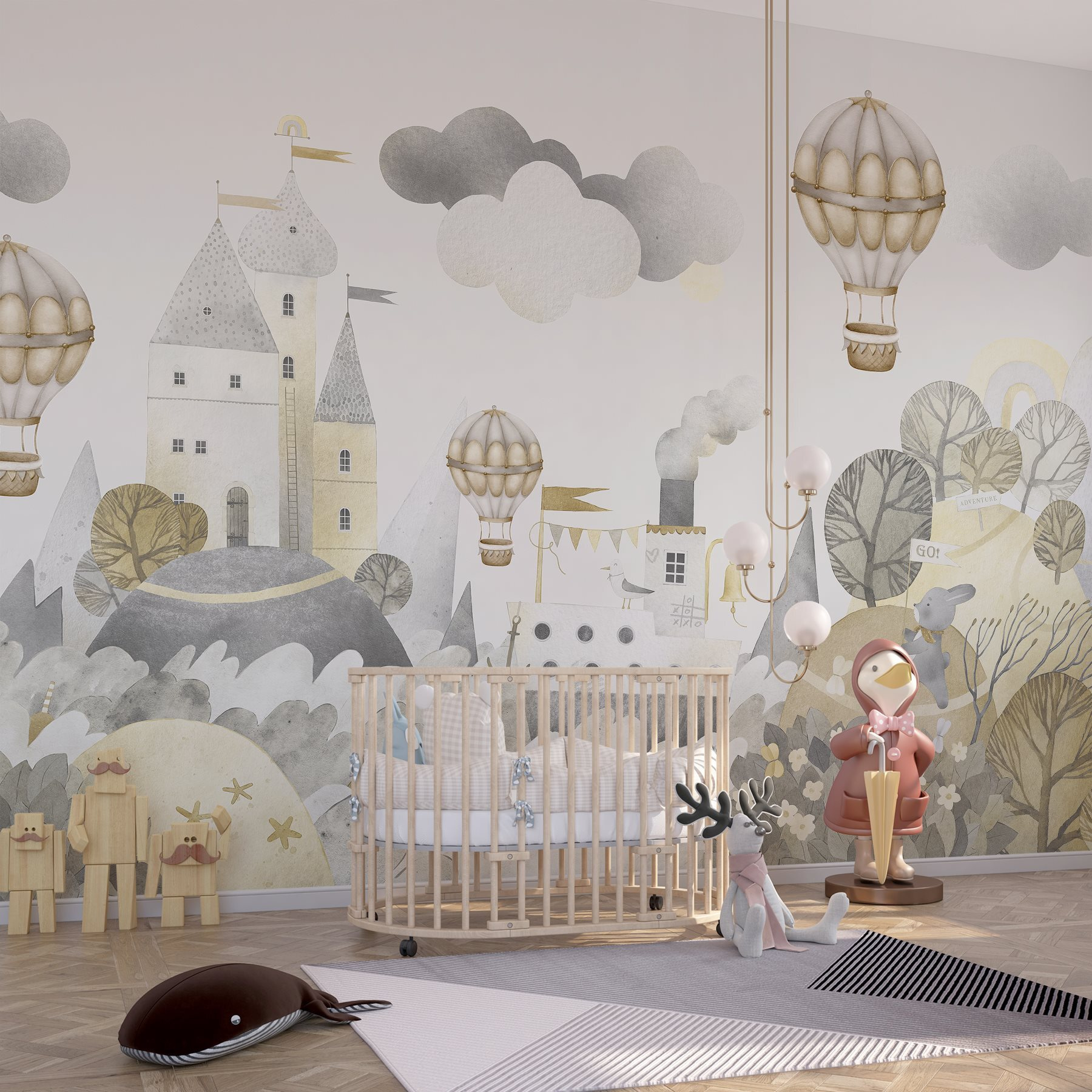 Transforme uma sala numa aventura fantástica com este encantador mural em aquarela, com um castelo de sonho e balões de ar quente encantadores. Imagine as crianças a passear por terras encantadas, com a imaginação a voar tão alto quanto esses balões. As cores suaves e os detalhes encantadores criam um ambiente acolhedor e ao mesmo tempo espaçoso, perfeito para salas de jogos ou quartos de bebé. Imagine aqueles momentos tranquilos, lendo histórias sob o olhar de um castelo amigável. Quase dá para ouvir o suave zumbido dos balões e as risadas das crianças enquanto exploram seu novo reino. Cada olhar para este mural promete uma centelha de alegria e inspiração. Quem não gostaria de mergulhar neste conto de fadas?